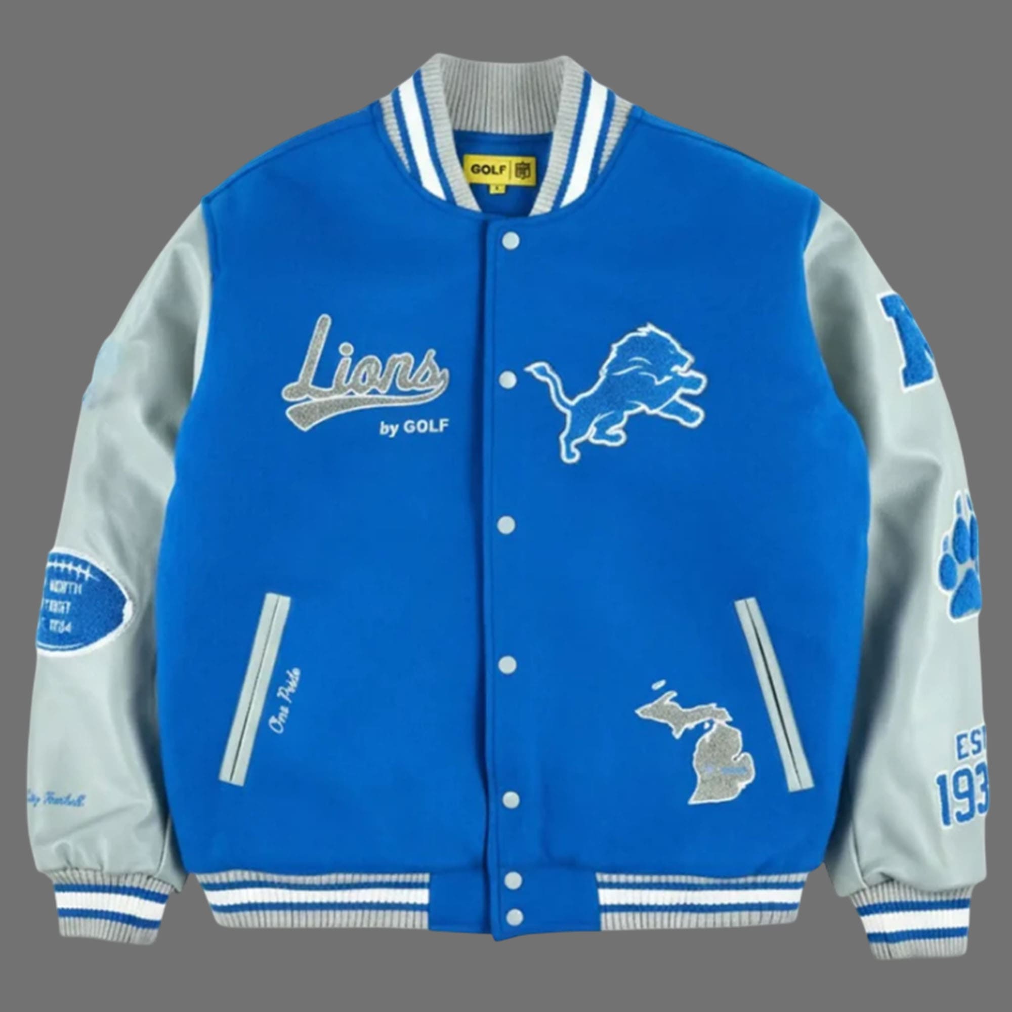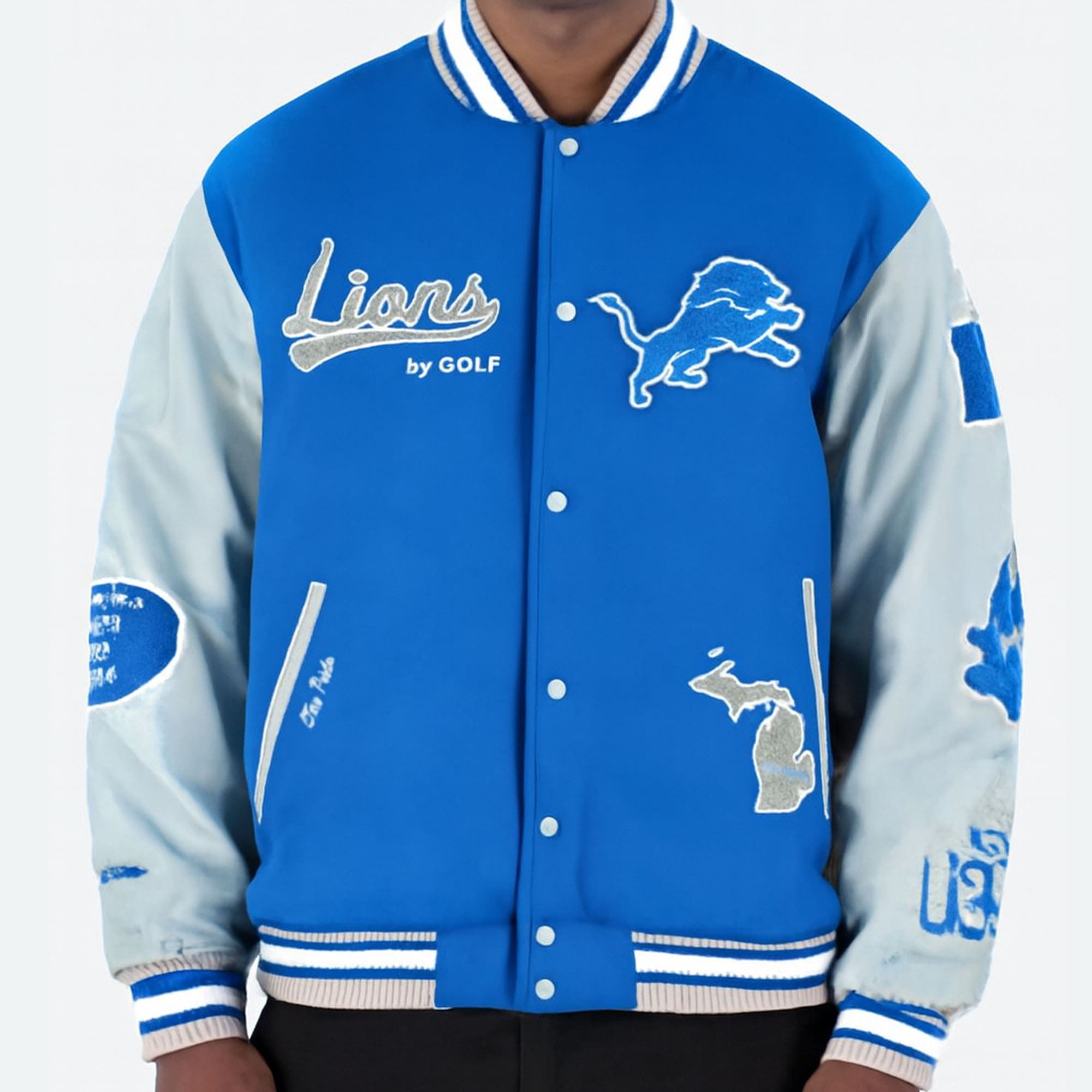 The 2025 Detroit Lions By Golf One Pride Jacket is a must-have for every Lions fan. This bold and stylish jacket combines classic varsity elements with a modern twist, featuring a vibrant blue body paired with silver sleeves. The embroidered Lions by Golf logo and a detailed lion graphic capture the team’s fierce pride. Additional design elements, such as a Michigan state outline and a football patch, pay homage to the team’s deep roots in the state. With its throwback style and sporty feel, this jacket is perfect for showing off your team spirit while staying comfortable.
