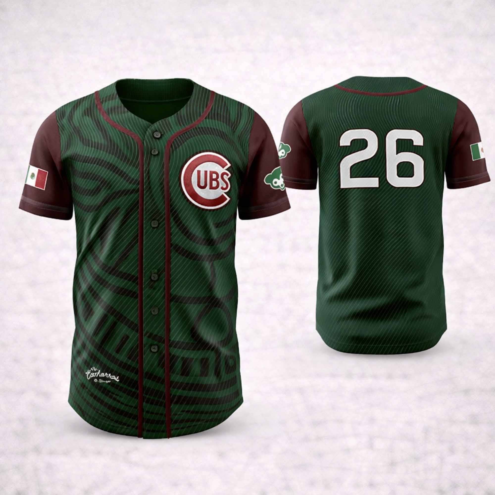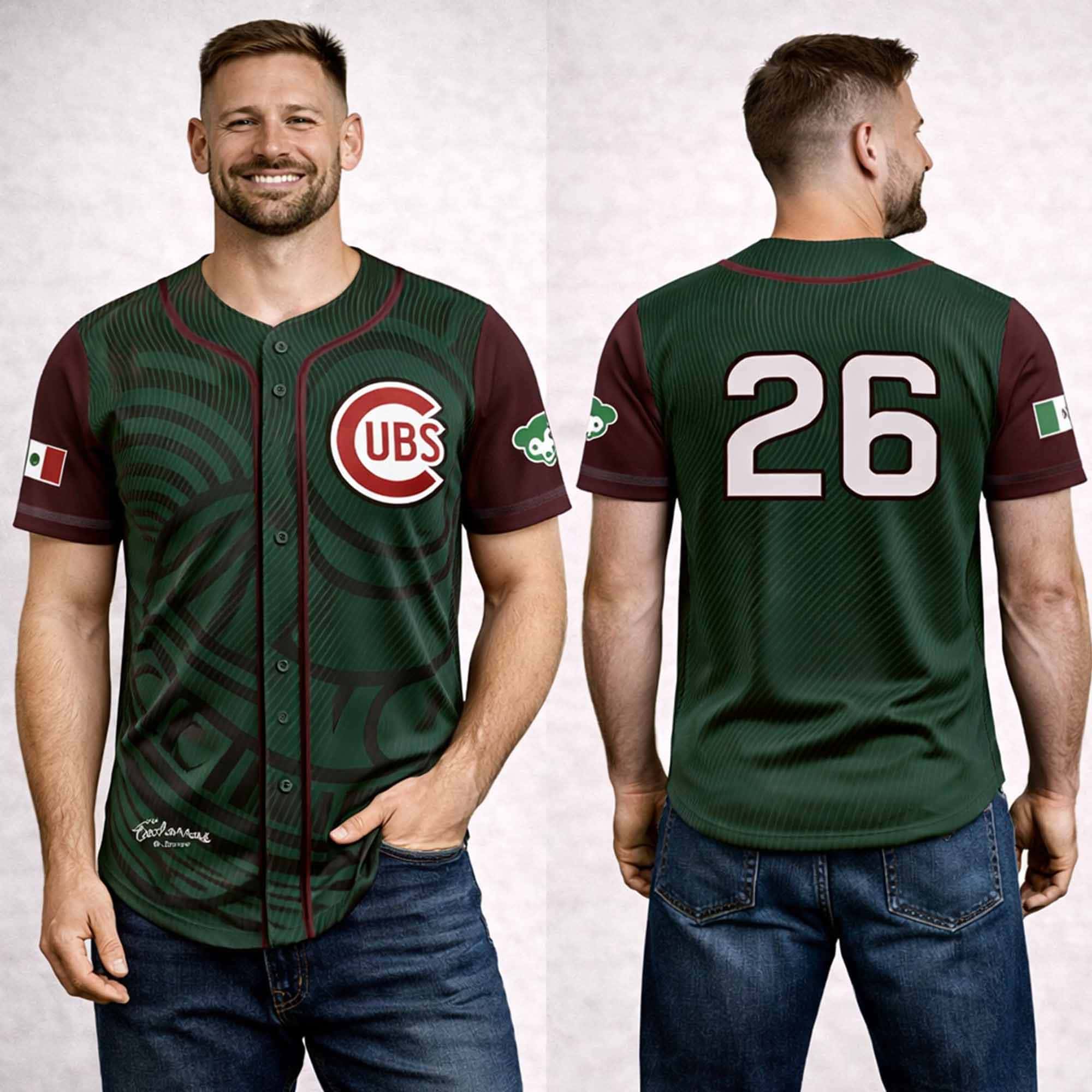 The design is built around a rich green body with deep red sleeves and trim, drawing from colors closely associated with Mexican identity and celebration. Across the jersey, the tonal graphic pattern adds movement and depth, giving the piece a bold, modern look while honoring cultural expression. The front features a Chicago-inspired chest emblem along with elegant script detail near the lower front, creating a balanced design that feels both athletic and commemorative. On the sleeves, flag-inspired accents reinforce the heritage-night theme, while the back number styling completes the classic game-day look. Altogether, the jersey captures the spirit of 2026 Cubs Mexican Heritage Night, turning a giveaway item into a wearable reminder of pride, tradition, and connection.