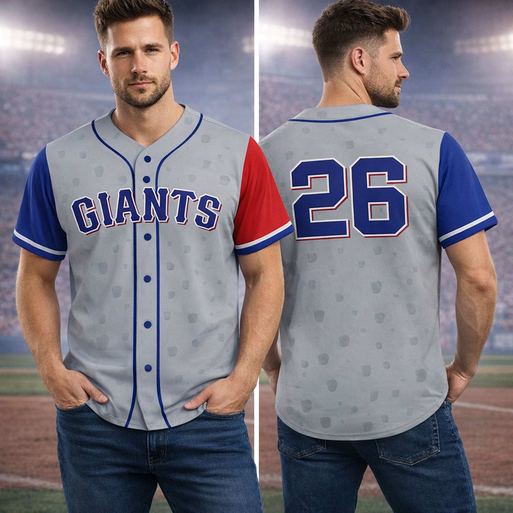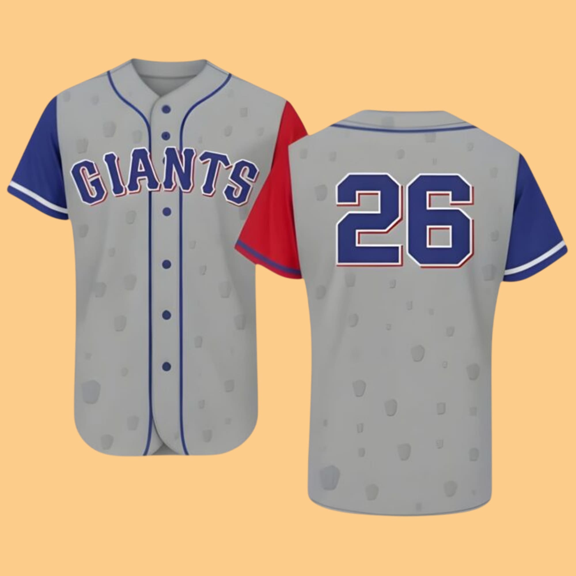 This jersey features a clean gray base with bold GIANTS lettering across the chest, reflecting timeless baseball tradition. The contrasting blue and red sleeve accents add a dynamic, modern edge while symbolizing unity, heritage, and celebration. The number 26 printed on the back represents the commemorative year, making this piece a true collectible tied to a special moment in Giants history.