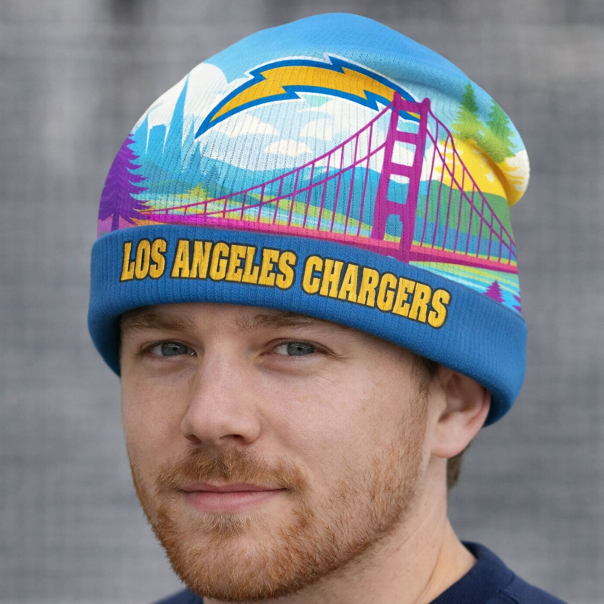 The 2026 Los Angeles Chargers Bad Bunny Bowl LX Beanie Hat beanie is designed to celebrate the unique blend of football passion, modern pop culture, and West Coast creativity. This hat features a vibrant, eye-catching graphic that combines iconic cityscapes with energetic colors, creating a look that is both playful and powerful. The design draws inspiration from the music, culture, and vibrant atmosphere surrounding the Bowl LX moment.