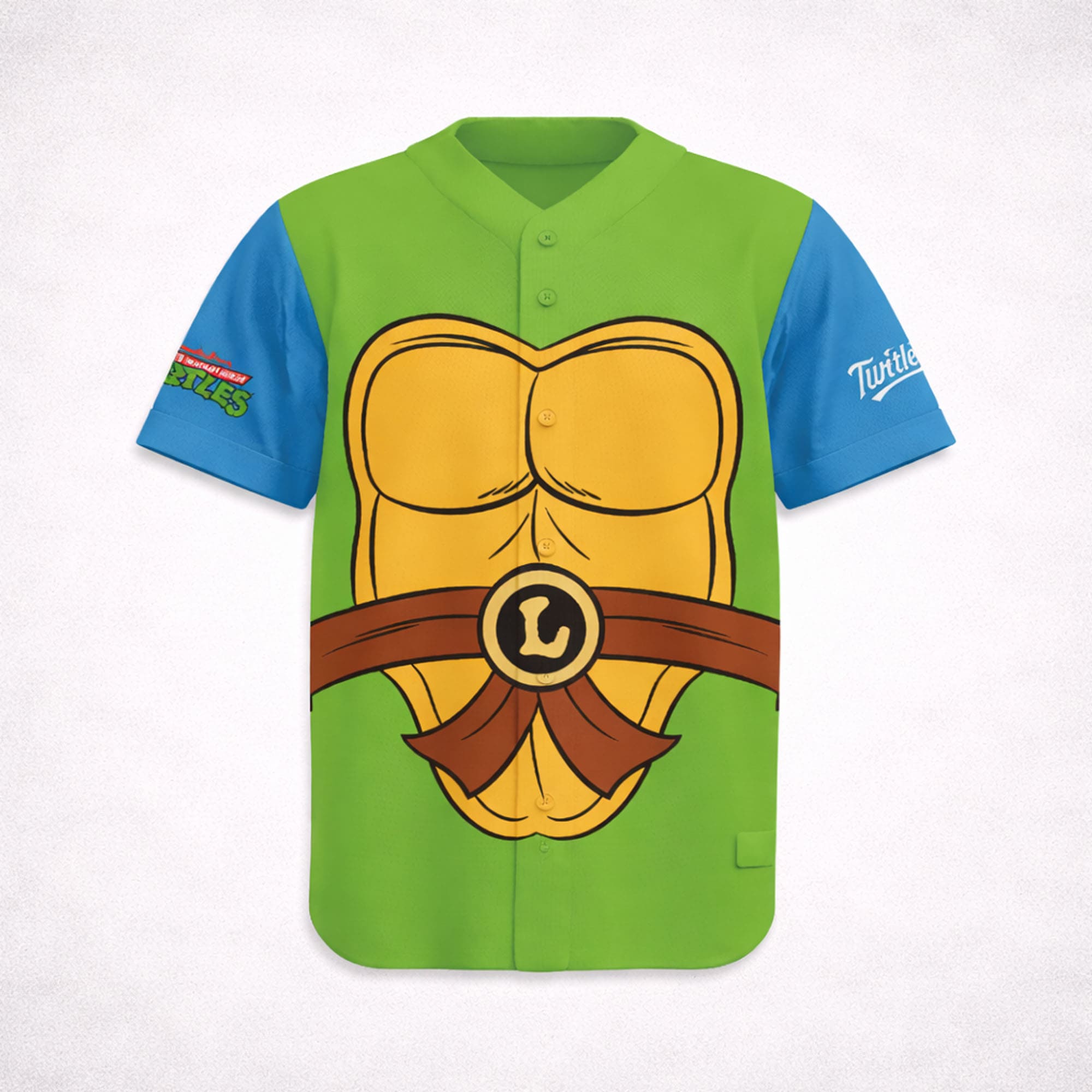 The 2026 Minnesota Twins Teenage Mutant Ninja Turtles Day Jersey Giveaway is a bold and playful piece made for fans who love collectible game-day style. Inspired by the unforgettable look of the famous turtle heroes, this jersey features a bright green body, blue sleeves, and a large shell-and-belt graphic across the front for a design that instantly stands out. The cartoon-inspired details create a fun, nostalgic vibe while still keeping the classic button-front jersey structure that sports fans love.