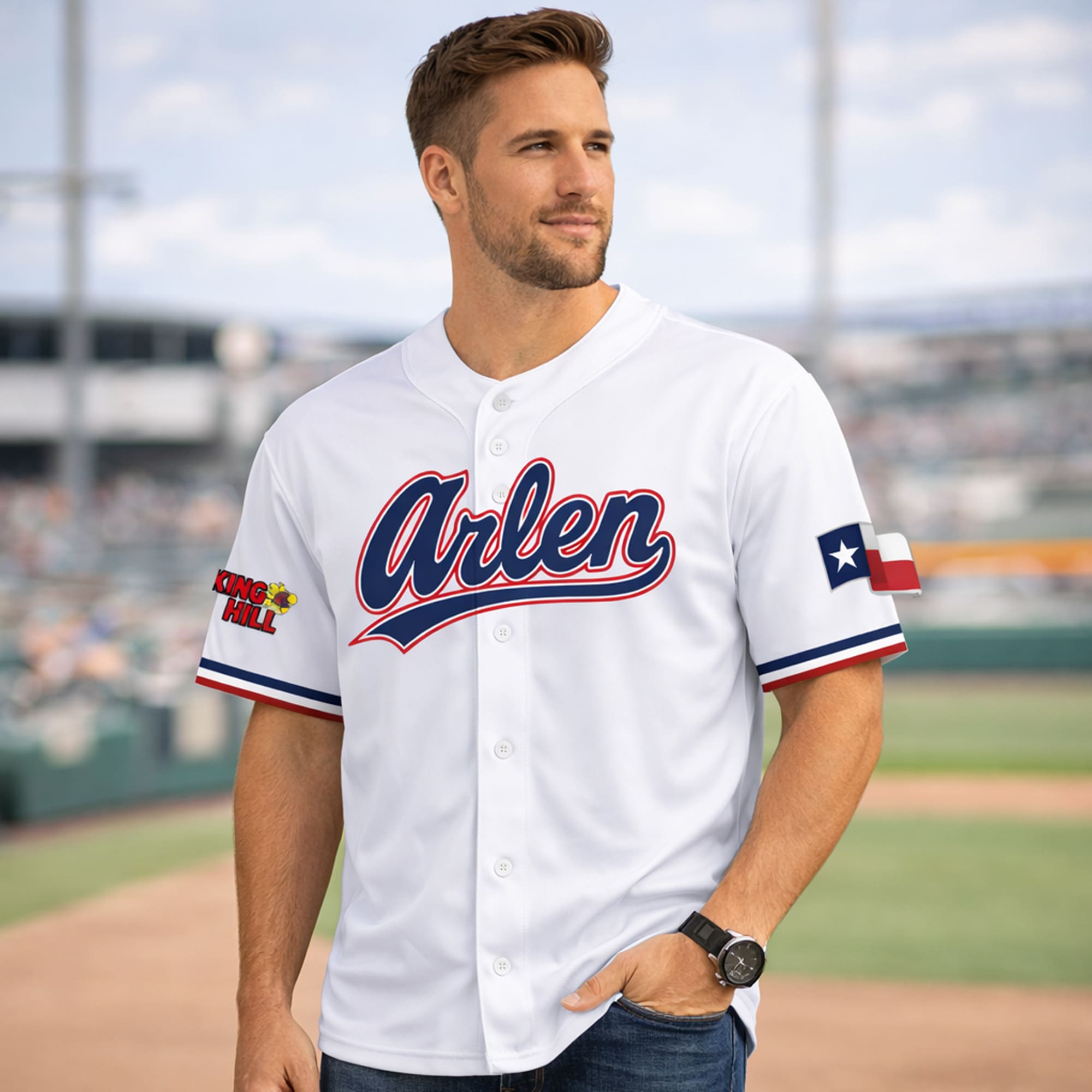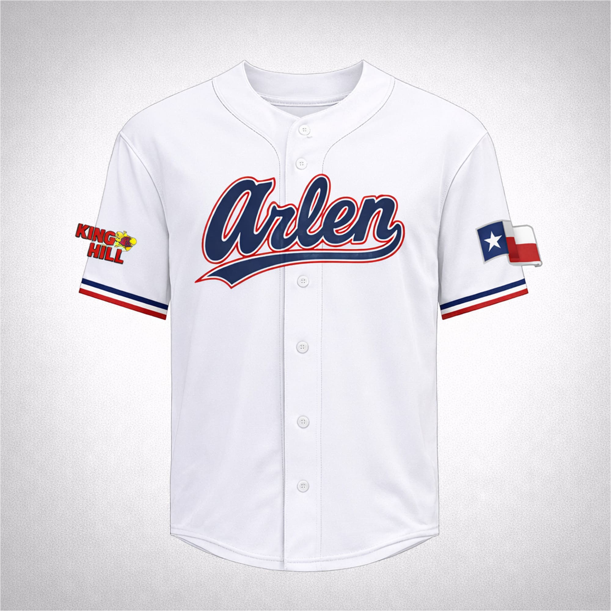 The 2026 Rangers King of the Hill Jersey Giveaway is a standout collectible for fans who enjoy baseball style mixed with a playful pop-culture twist. This jersey features a clean white base that gives the design a classic on-field look, while the bold blue-and-red script across the chest adds strong visual impact. The sleeve details make this piece even more memorable, with a King of the Hill graphic on one side and a Texas flag patch on the other, creating a design that feels rooted in Texas identity, humor, and hometown pride.