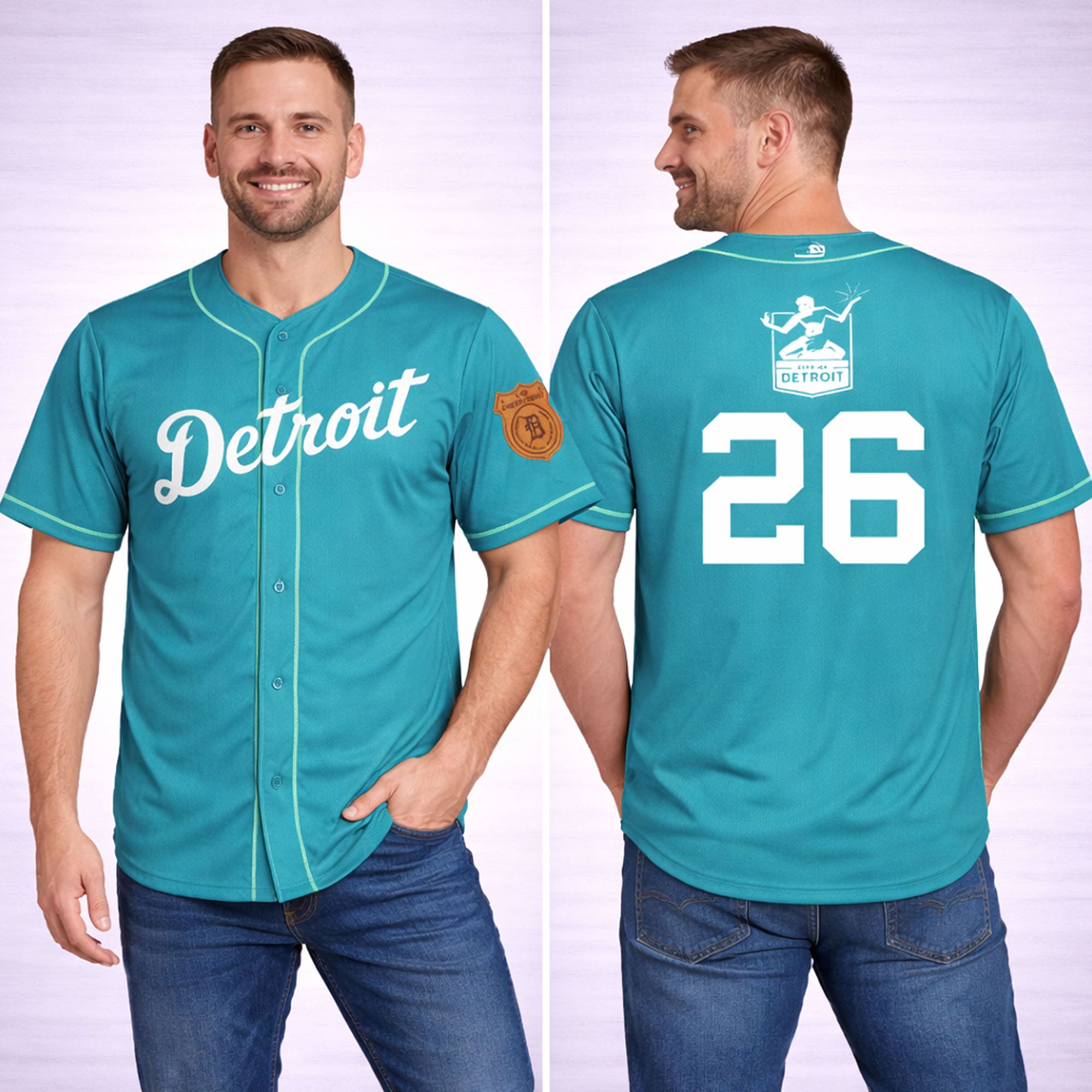 This jersey is designed to honor the spirit of service, protection, and public commitment associated with Law Enforcement Night. The bold teal base gives the jersey a fresh modern look, while the white Detroit script keeps the design rooted in classic Tigers identity. On the sleeve, the badge-inspired patch adds a clear visual connection to the law enforcement theme, turning the jersey into more than a game-day item. The back design, featuring the large 26, helps mark it as a memorable 2026 giveaway keepsake tied to a specific night at Comerica Park. Its overall look blends baseball tradition with appreciation for those who serve the community.