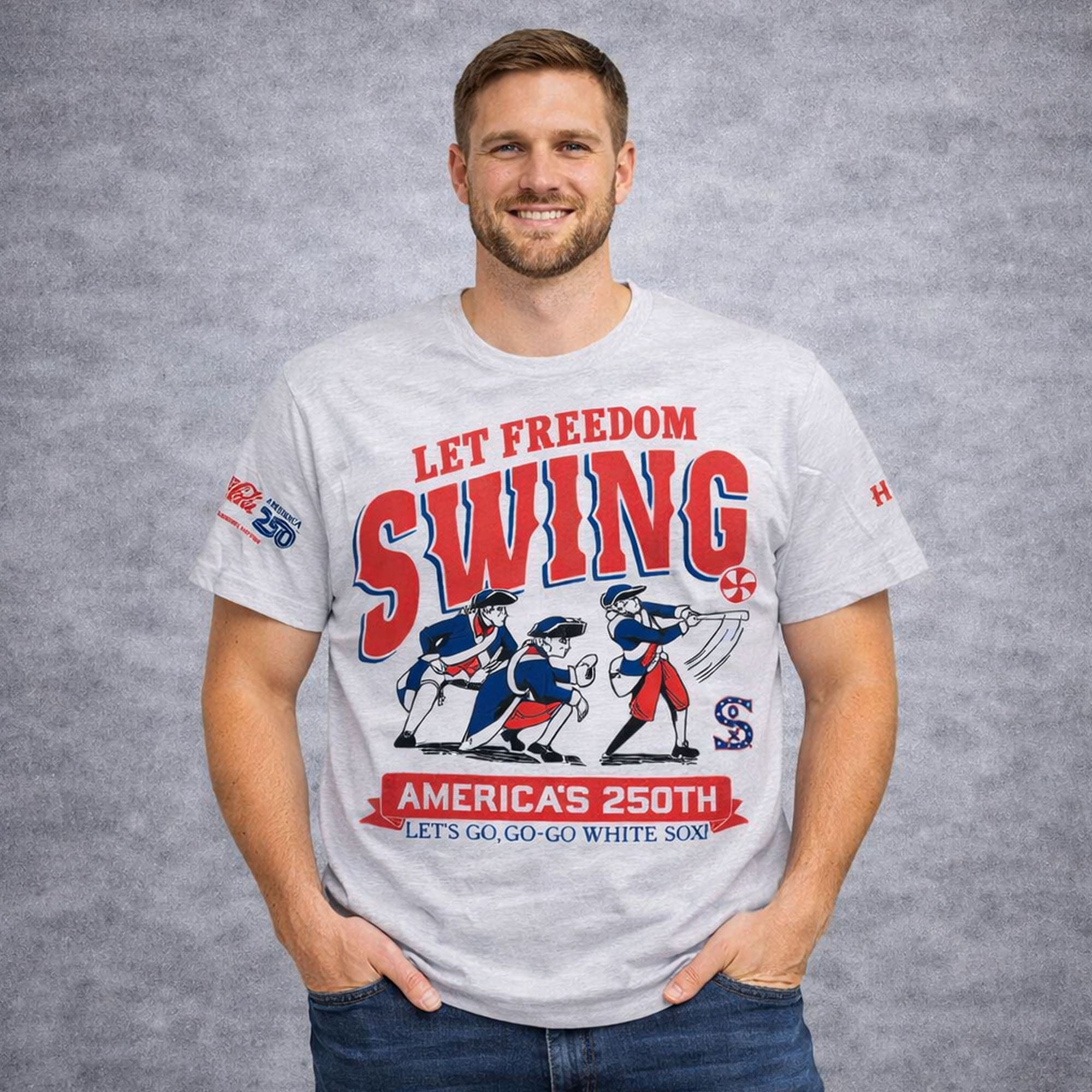 The 2026 White Sox America’s 250th Homage T-Shirt is a fun and memorable piece that blends baseball energy with a patriotic tribute to America’s 250th celebration. Designed on a soft light base, this T-shirt stands out with bold red and blue lettering, vintage-inspired player artwork, and a layout that captures the spirit of freedom, tradition, and summer baseball. The graphic has a retro feel that makes it instantly eye-catching while still easy to wear with everyday outfits.