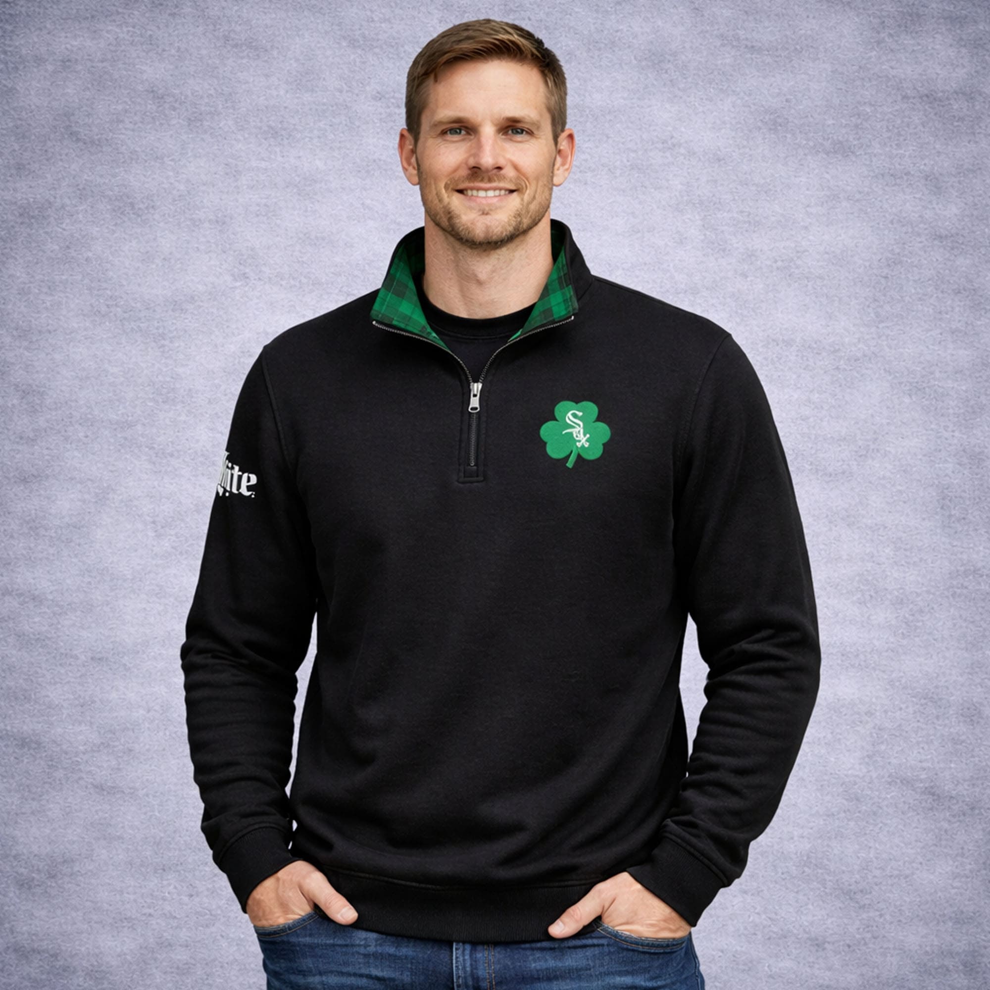 The 2026 White Sox Irish Quarter Zip Hoodie Giveaway is a clean and stylish layer made for fans who love a simple look with a festive seasonal touch. Designed with a sleek black base, this piece stands out through its bright green shamrock chest detail and matching green plaid lining inside the collar. The contrast creates a sharp, polished appearance that feels sporty, modern, and perfect for Irish-themed game nights. The quarter-zip front also adds a versatile finish, making it easy to wear open or zipped up depending on the weather.