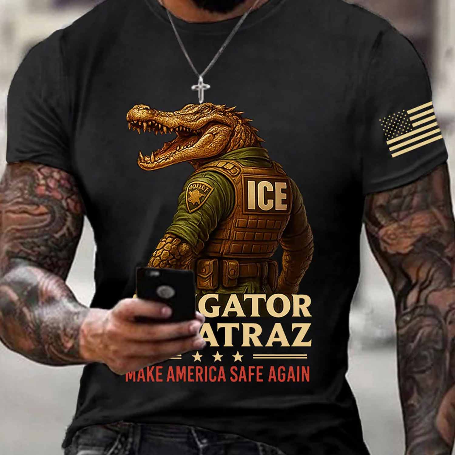 This shirt brings together several powerful symbols in a bold, imaginative way. The central image of an alligator in tactical gear cleverly fuses the raw power of one of Florida’s most iconic predators with imagery often associated with law enforcement or security. This juxtaposition creates a strong visual narrative. The phrase “GATOR ALCATRAZ” humorously suggests an ultimate form of confinement or control, implying an unbreakable, perhaps even primal, force at play. The inclusion of the distressed American flag and the phrase “MAKE AMERICA SAFE AGAIN” adds a layer of patriotic and aspirational sentiment to the design, suggesting a desire for strength and security.