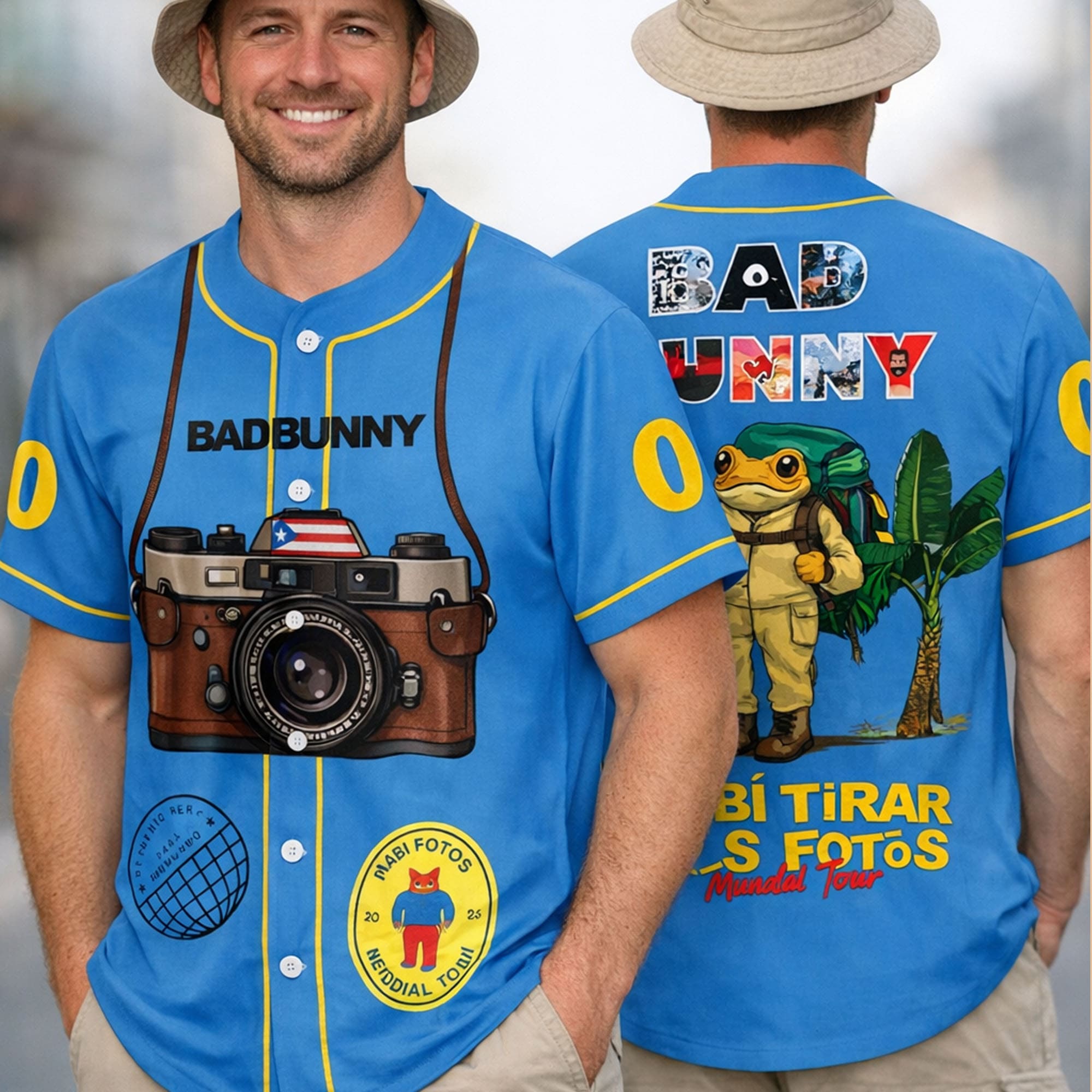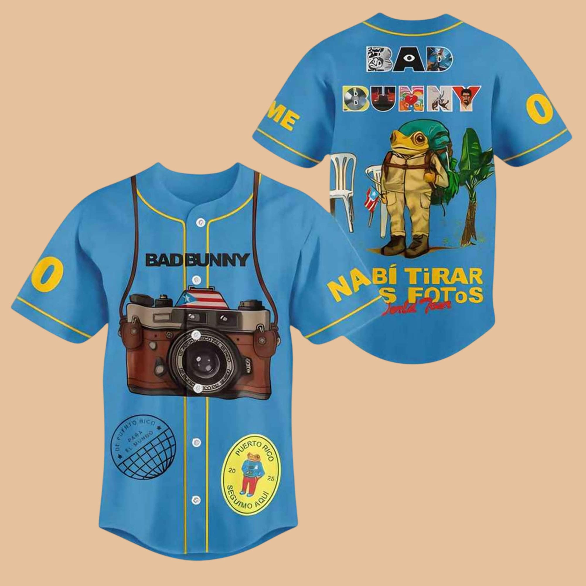 Bring music, nostalgia, and island energy to your wardrobe with the Bad Bunny Debí Tirar Más Fotos Jersey. This baseball-style button-down design is inspired by the iconic phrase “Debí Tirar Más Fotos”—a reminder to live in the moment and capture the memories. The front features a bold camera graphic with Puerto Rico details and travel-style patches that echo adventure, pride, and personal stories. Turn it around and you’ll find vibrant “Bad Bunny” lettering plus playful tropical artwork, creating a full look that feels like a postcard from the Caribbean.