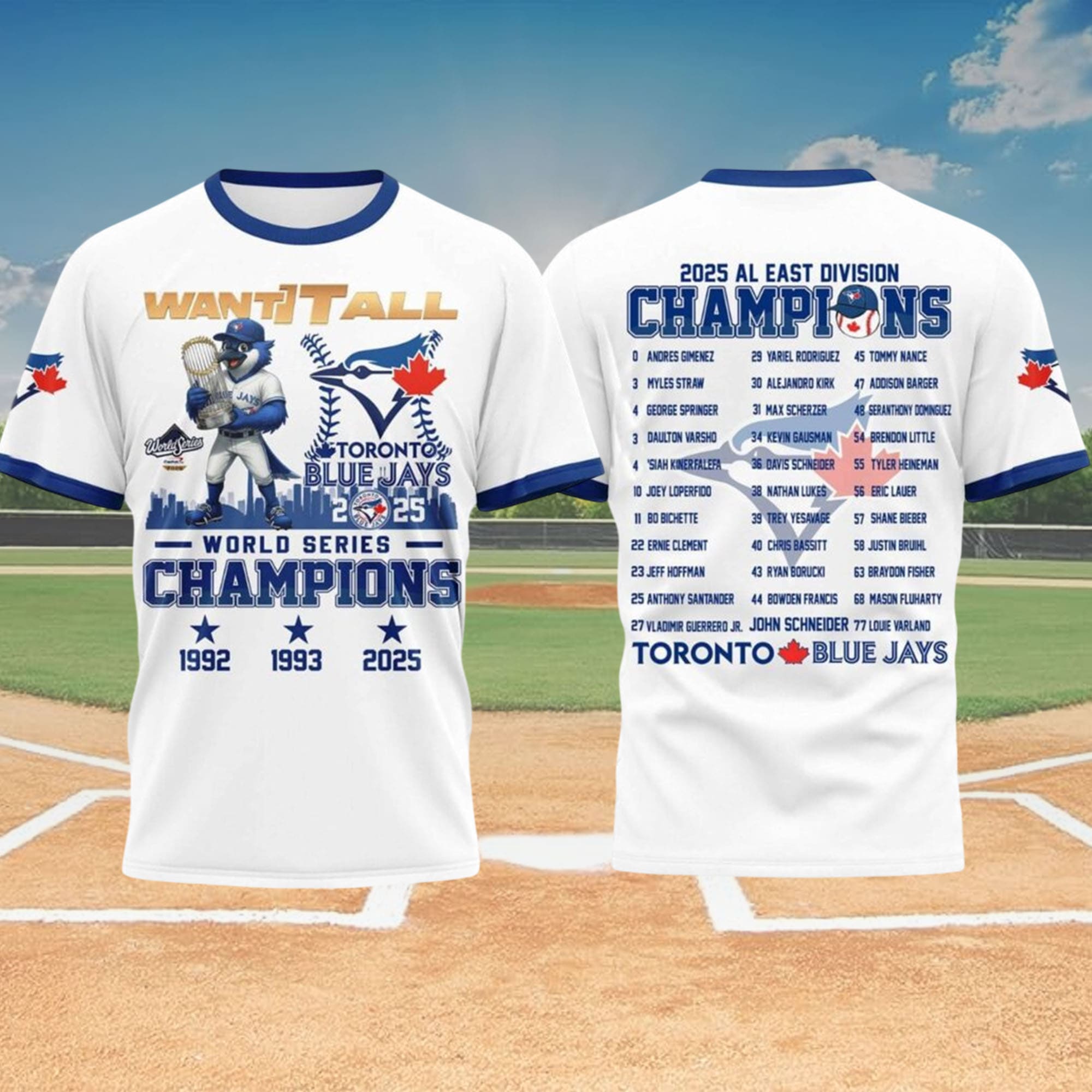 Celebrate history in the making with the Blue Jays World Series Champions 2025 Want It All Shirt. This design captures Toronto’s unstoppable spirit, blending nostalgia and pride in one bold look. The front features a powerful Blue Jays graphic with the slogan “Want It All”, symbolizing the team’s relentless drive and unity through the 2025 championship run. On the back, the names of the 2025 roster stand proudly beneath the AL East Division Champions title, creating a collector’s piece that honors every player who brought the trophy home. The design also pays tribute to Toronto’s legendary 1992 and 1993 titles, completing the visual story of a three-time dynasty.