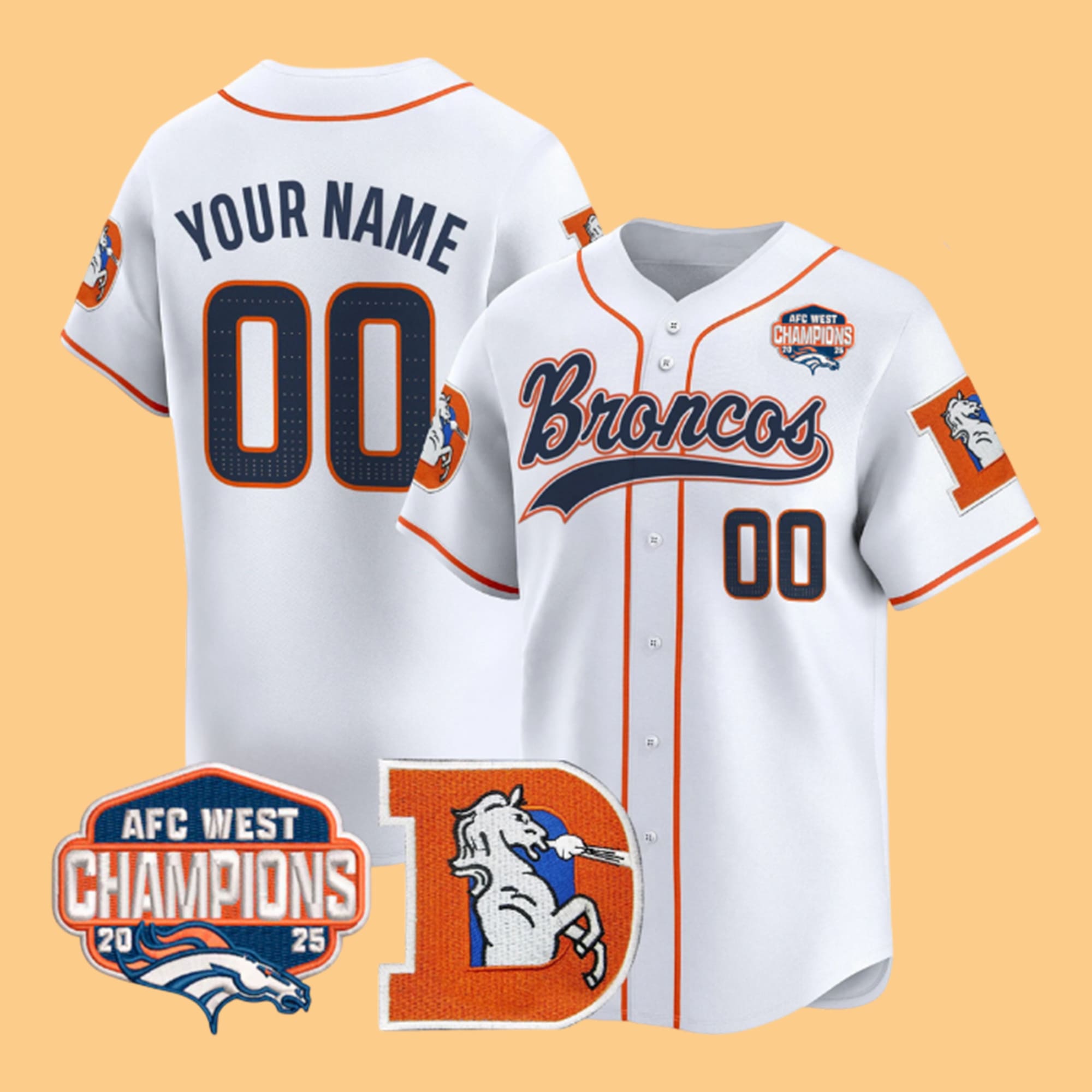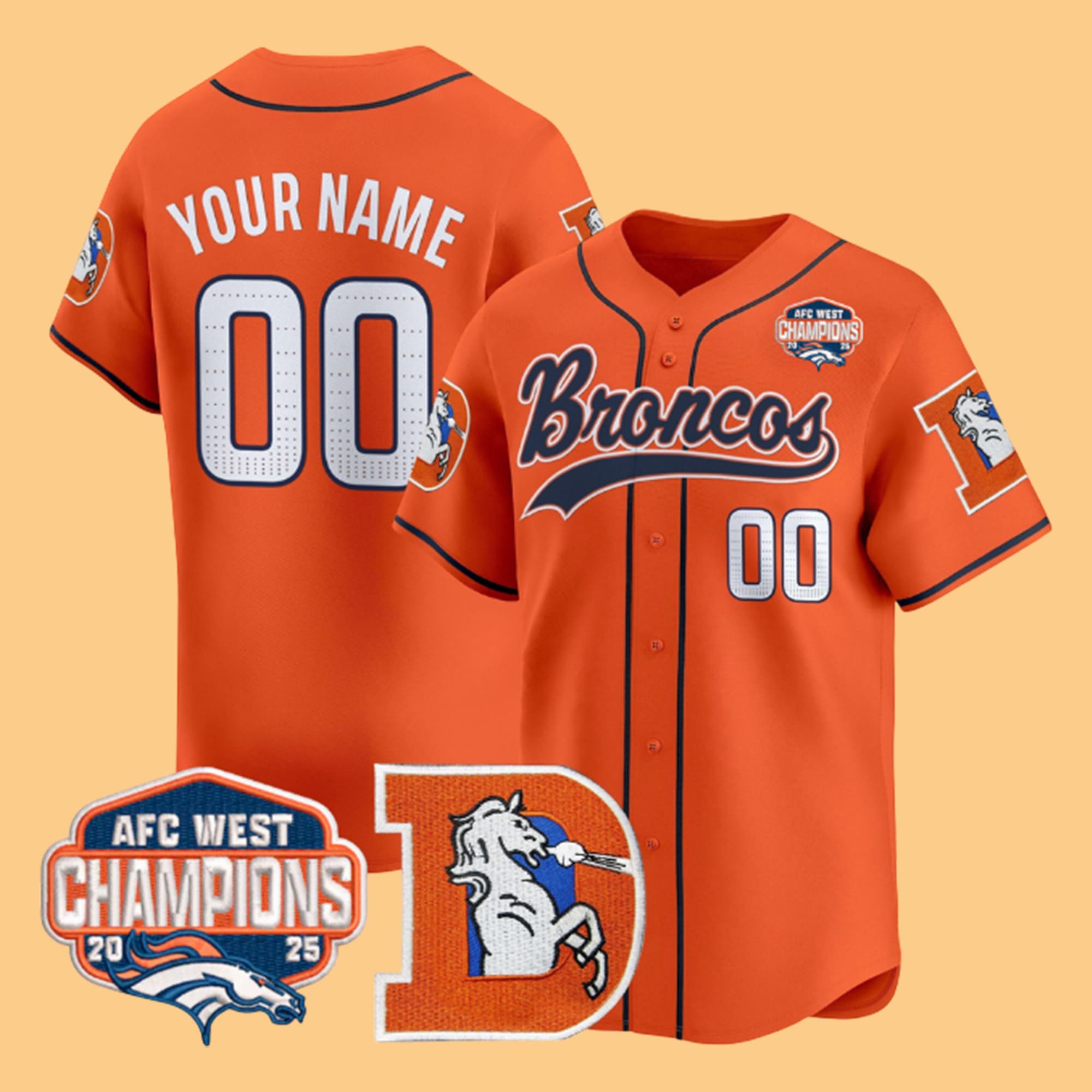This baseball jersey showcases a classic button-up front with contrast piping and a bold Broncos script across the chest. The AFC West Champions patch adds a celebratory touch, while the athletic silhouette delivers a clean, confident look. Available in multiple color options, the design balances retro aesthetics with a modern vapor-style finish.