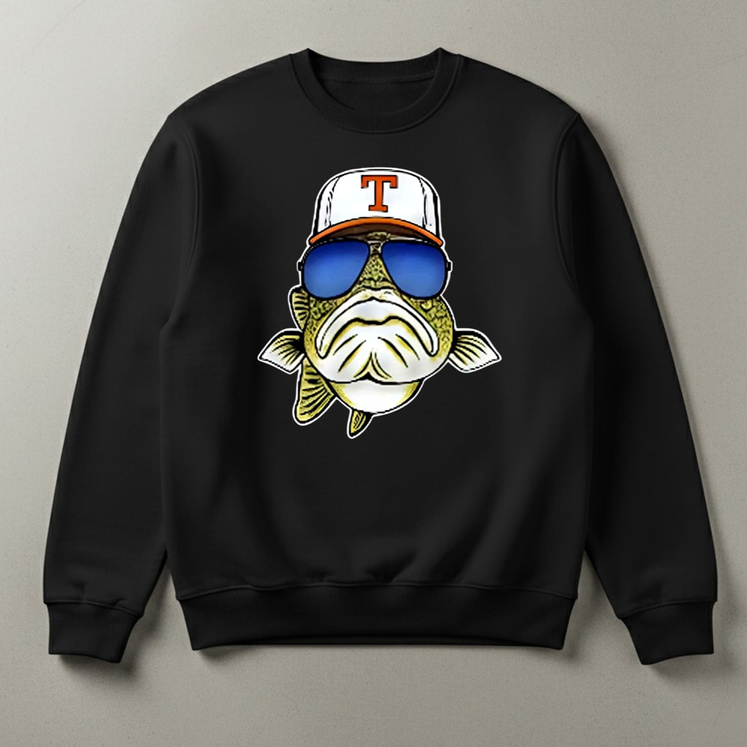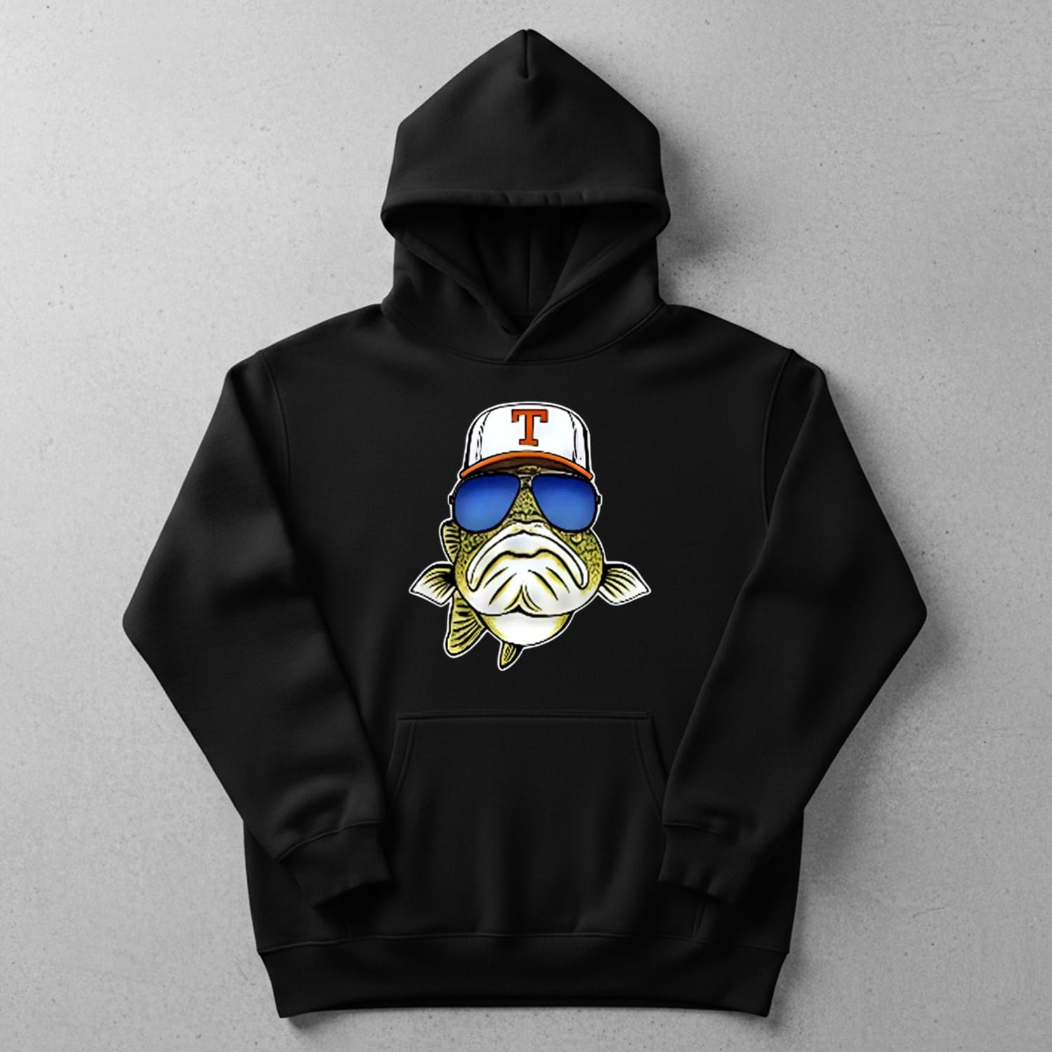 This sweatshirt features a vibrant, high-resolution print that combines a relaxed fishing vibe with a football twist. The bold colors and cartoon-style illustration pop beautifully on the deep black fabric, giving the design a crisp, standout look. Its unisex fit makes it easy to style with jeans, joggers, or outdoor gear.