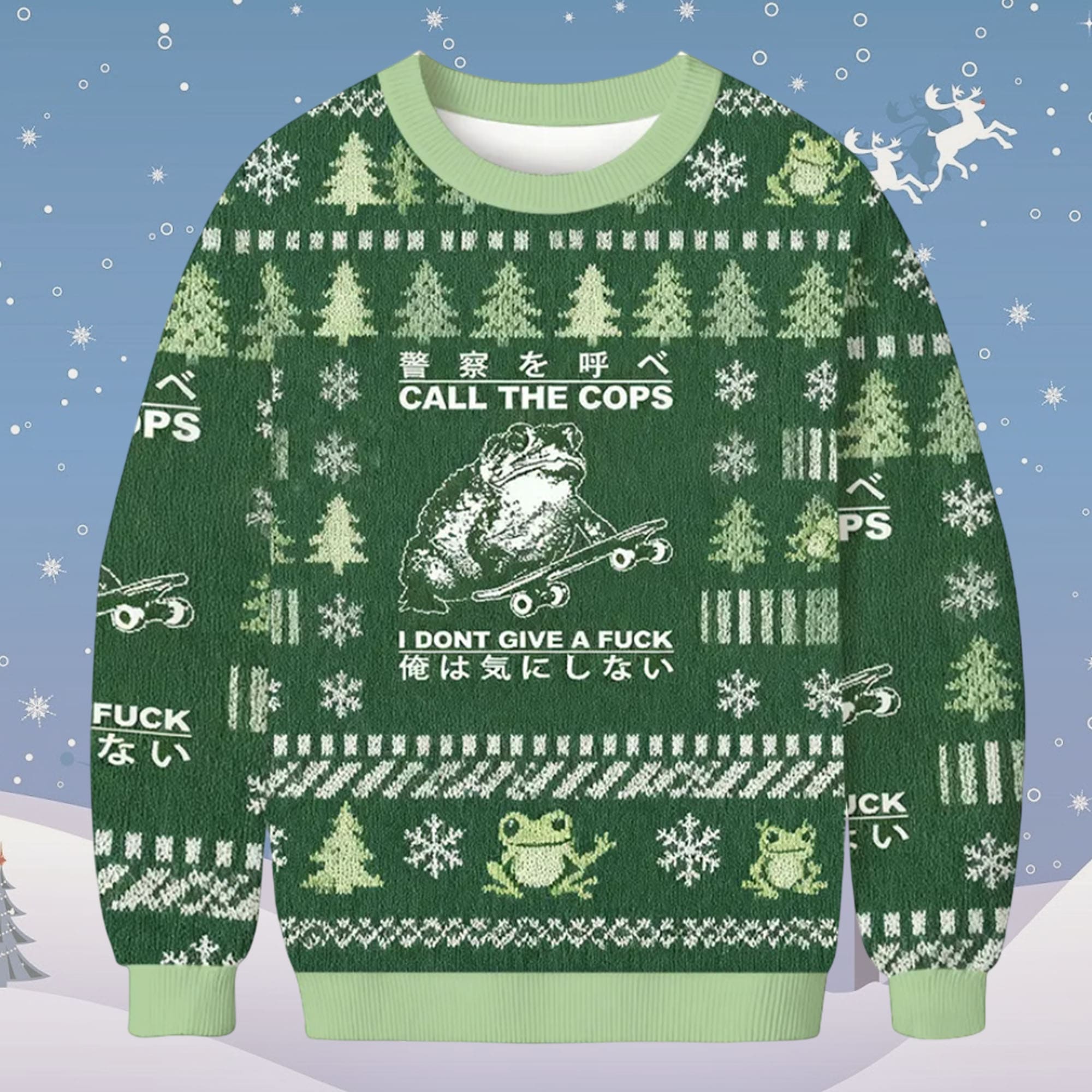 Turn Christmas into a comedy show with the Call The Cops I Don’t Give A Fuck Christmas Ugly Sweater. Designed in bold green tones with winter snowflakes, pine trees, and a chaotic skateboard frog graphic, this sweater is made for people who like their holidays loud, funny, and a little unhinged. The mix of English and Japanese text adds that meme-style street energy, making it perfect for parties, gaming nights, or the office “ugly sweater” day you were forced to attend.
