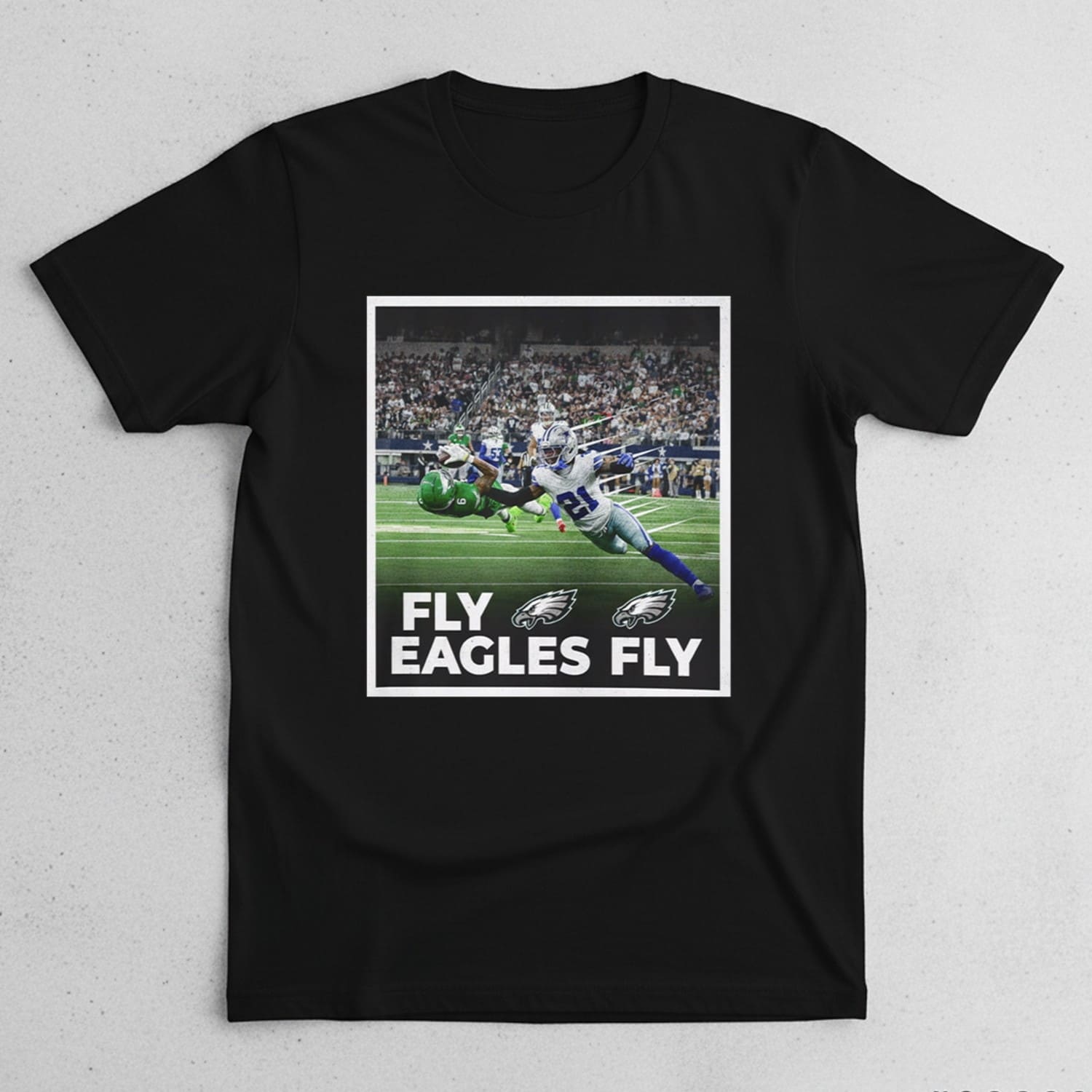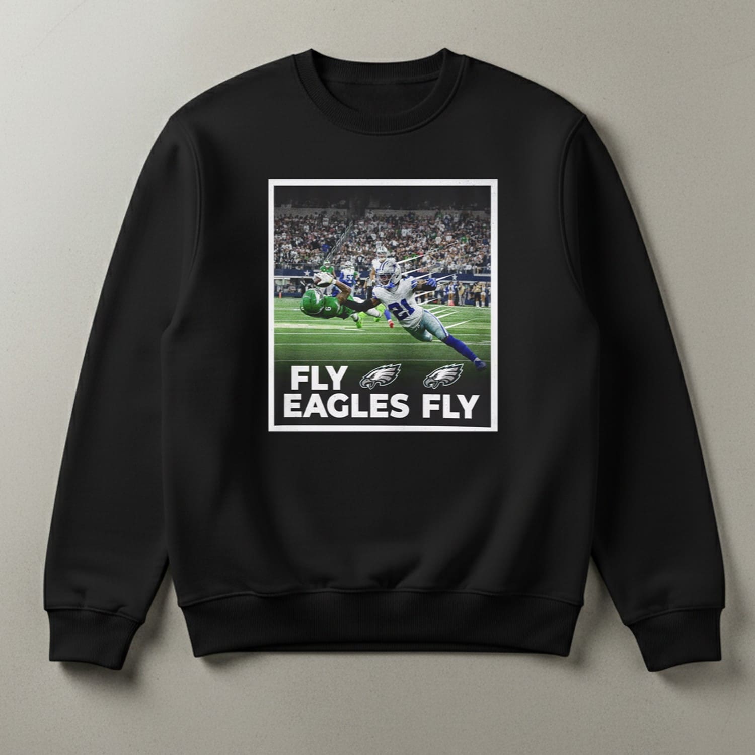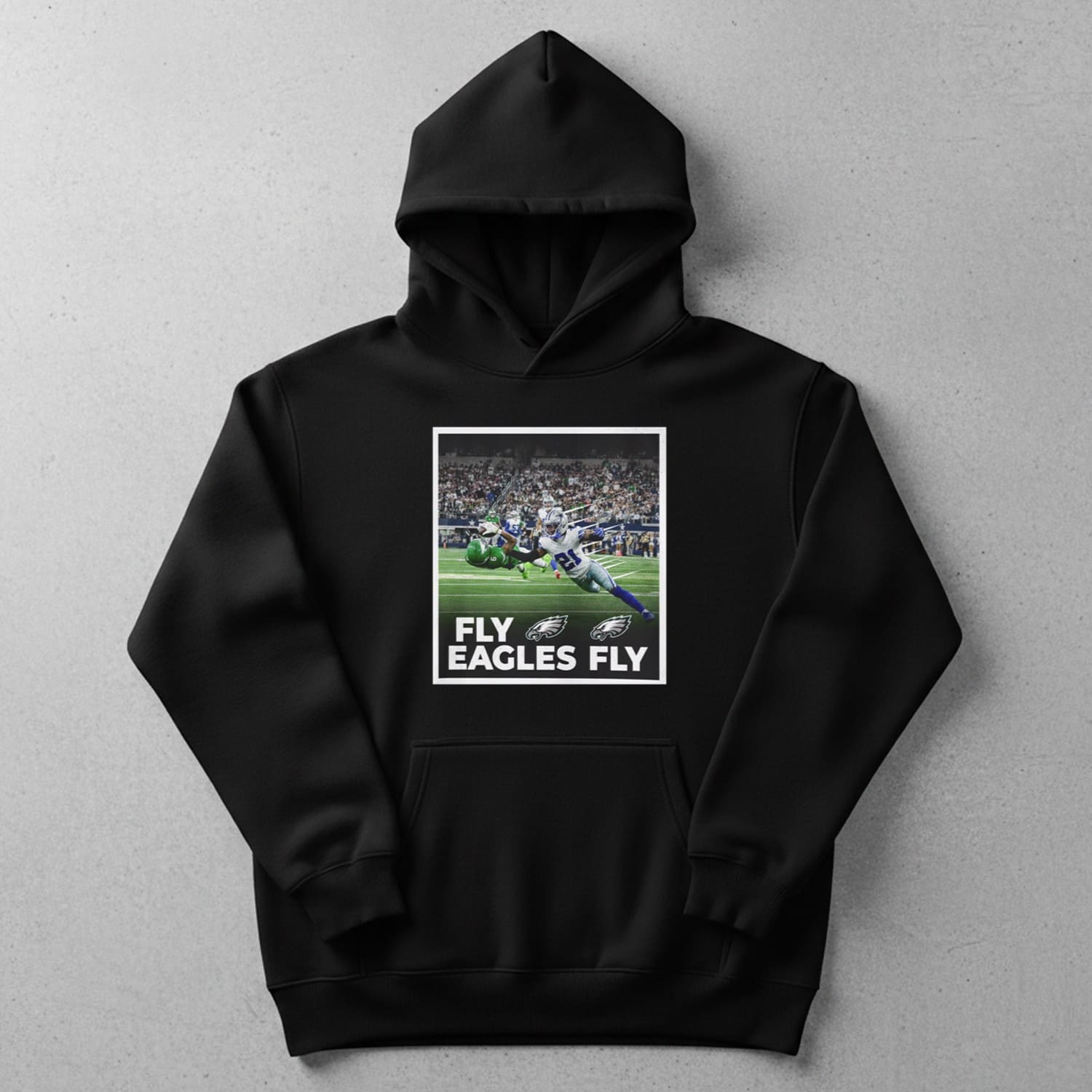The DeVonta Smith Touchdown Fly Eagles Fly Shirt captures the exact moment every fan lives for – a diving grab with the crowd on its feet and the “Fly Eagles Fly” rally cry stamped across the front. The framed graphic shows DeVonta stretching out toward the end zone while the bright green field and bold white text create a powerful, poster-style design.