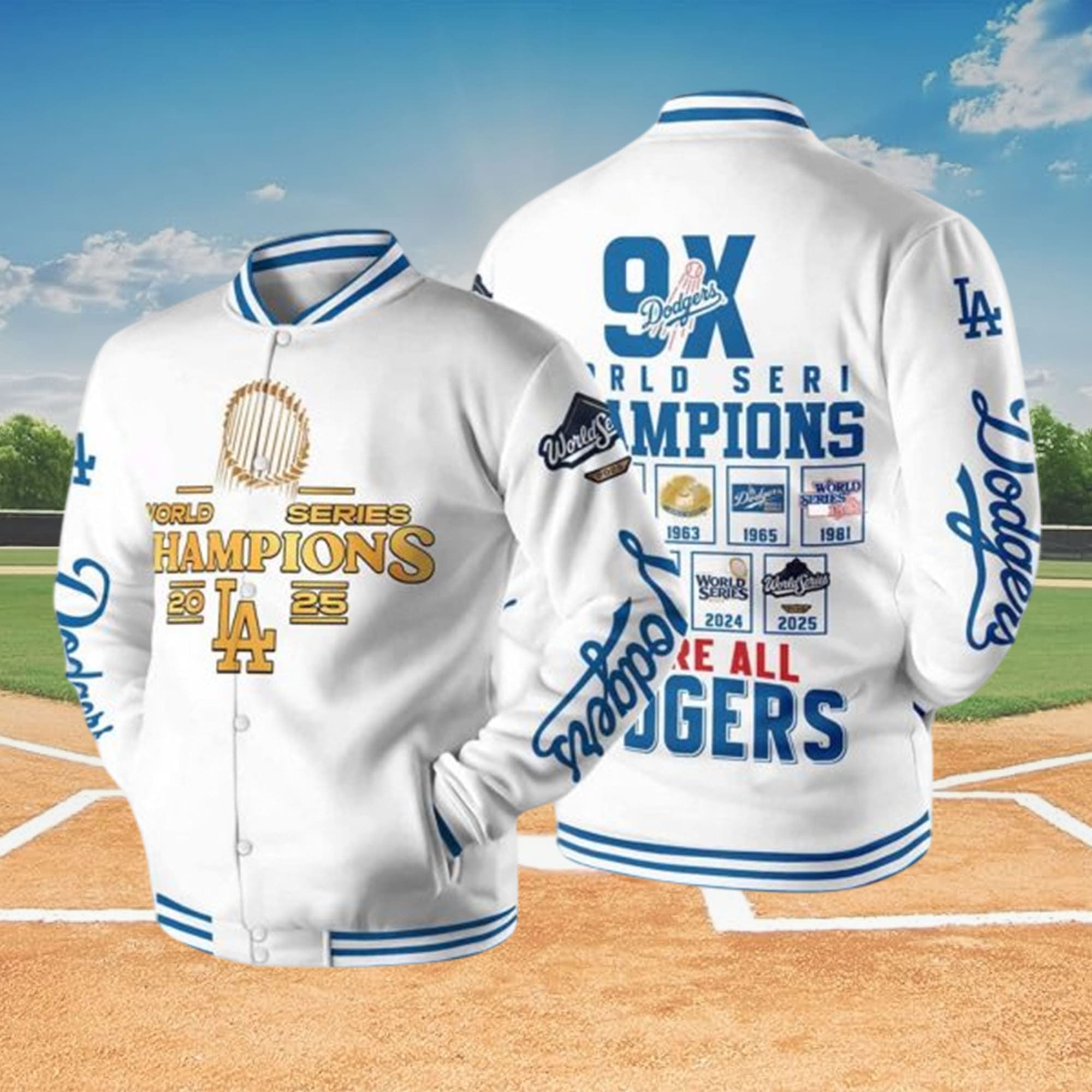 Step into baseball history with the Dodgers 9X World Series Champions 2025 Baseball Jacket, a tribute to nearly a century of glory. This stunning jacket captures the essence of victory, celebrating the team’s nine championships with pride and precision. The front proudly displays “World Series Champions 2025” alongside the Los Angeles logo and the golden trophy, symbolizing dedication and victory. The back features all the championship years—from 1963 to 2025—reminding fans of an unparalleled legacy built on teamwork, perseverance, and passion. Meticulous sleeve embroidery, bold typography, and color-blocked contrast stripes make this jacket a true statement for fans who live and breathe baseball.