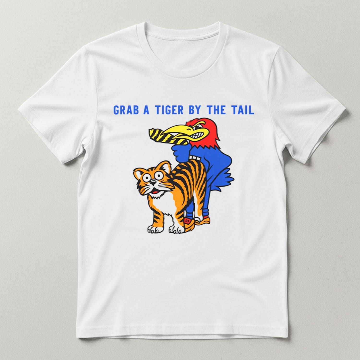 Show your playful side with the Grab A Tiger By The Tail Shirt. The front features a bright cartoon bird cheekily holding a wide-eyed tiger by the tail, plus the slogan “Grab A Tiger By The Tail” in bold blue text. It’s a fun statement tee for game day, watch parties, or anyone who loves humor and a little friendly rivalry.