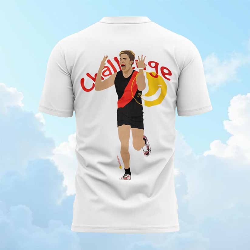 This T-shirt pays tribute to a heartwarming viral moment in AFL. The image captures Essendon Football Club player Matt Guelfi’s iconic celebration after kicking a goal, a direct response to a challenge from young fan Alexis, who was battling cancer. Alexis had dared Guelfi to kick a goal and perform “the Alexis Challenge” celebration. Guelfi delivered, and his infectious enthusiasm captured hearts globally. The “Challenge” text and smiley face directly reference Alexis’s dare and the joyous spirit of overcoming adversity, symbolizing hope, resilience, and the positive impact athletes can have beyond the field.