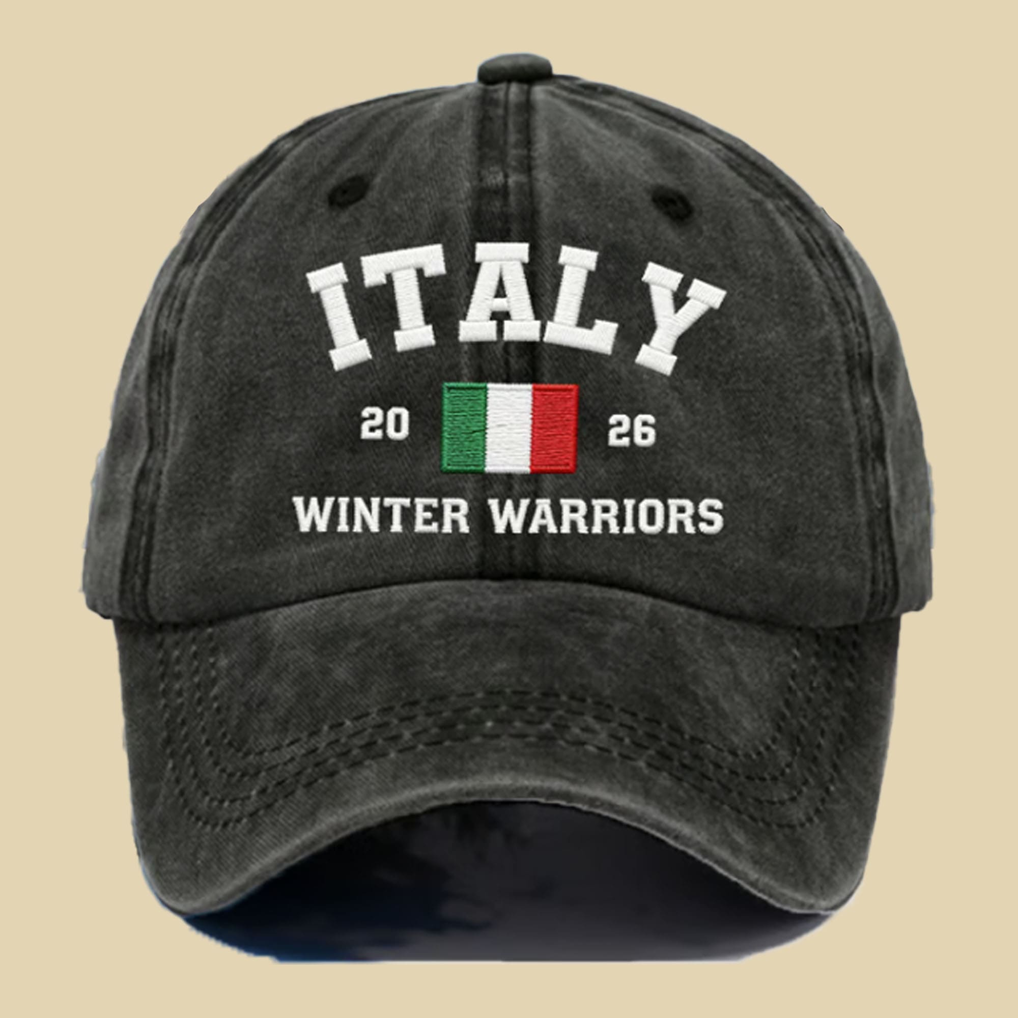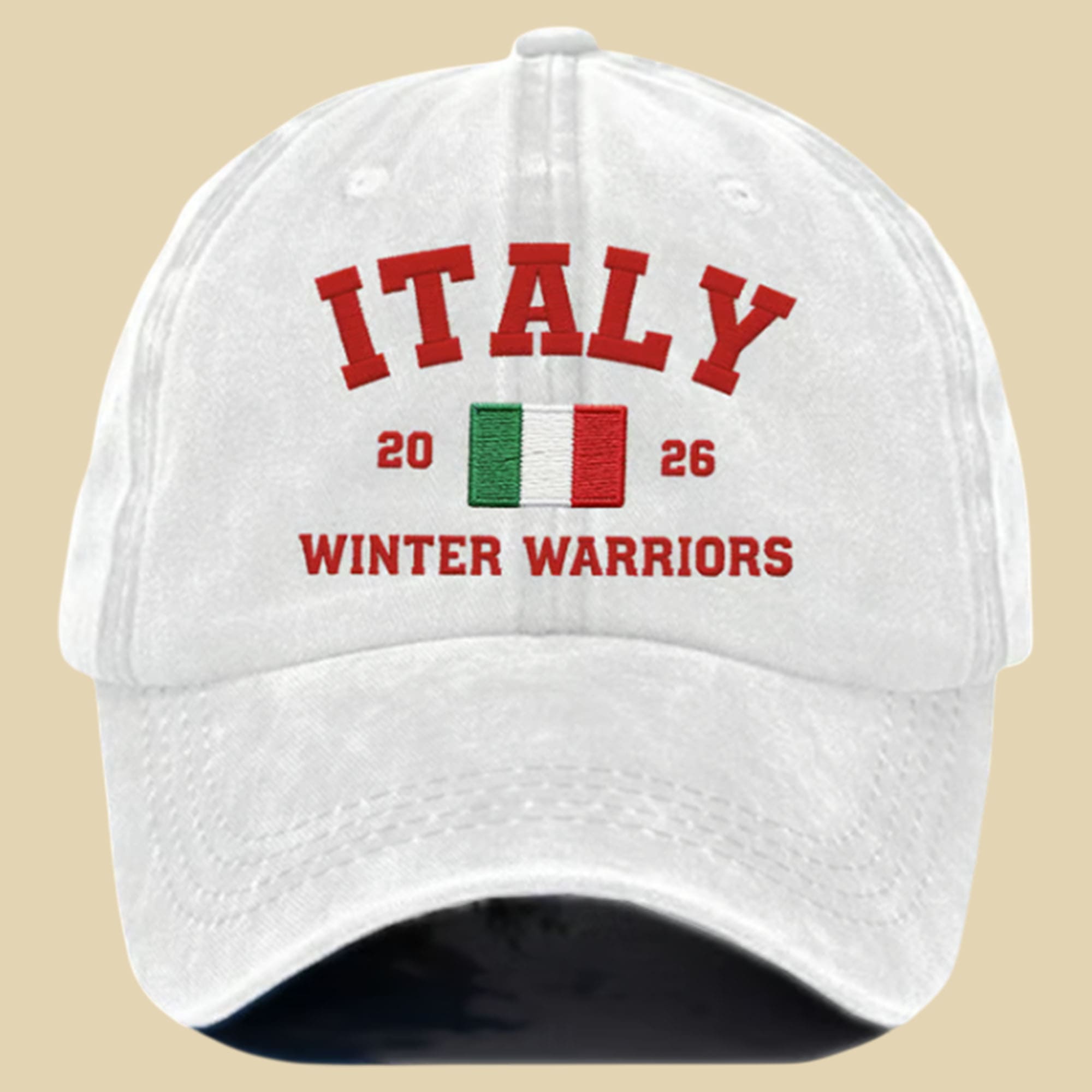 Show your winter-sport spirit in a clean, street-ready way with the Italy 2026 Winter Warriors Hat. This cap features a bold “ITALY” arch in bright white stitching, a centered Italian flag patch, and “2026” split on both sides for a balanced, sporty look. Finished with “WINTER WARRIORS” across the front, it gives you a confident, team-pride vibe without being loud—perfect for travel days, cold-season events, and everyday outfits.