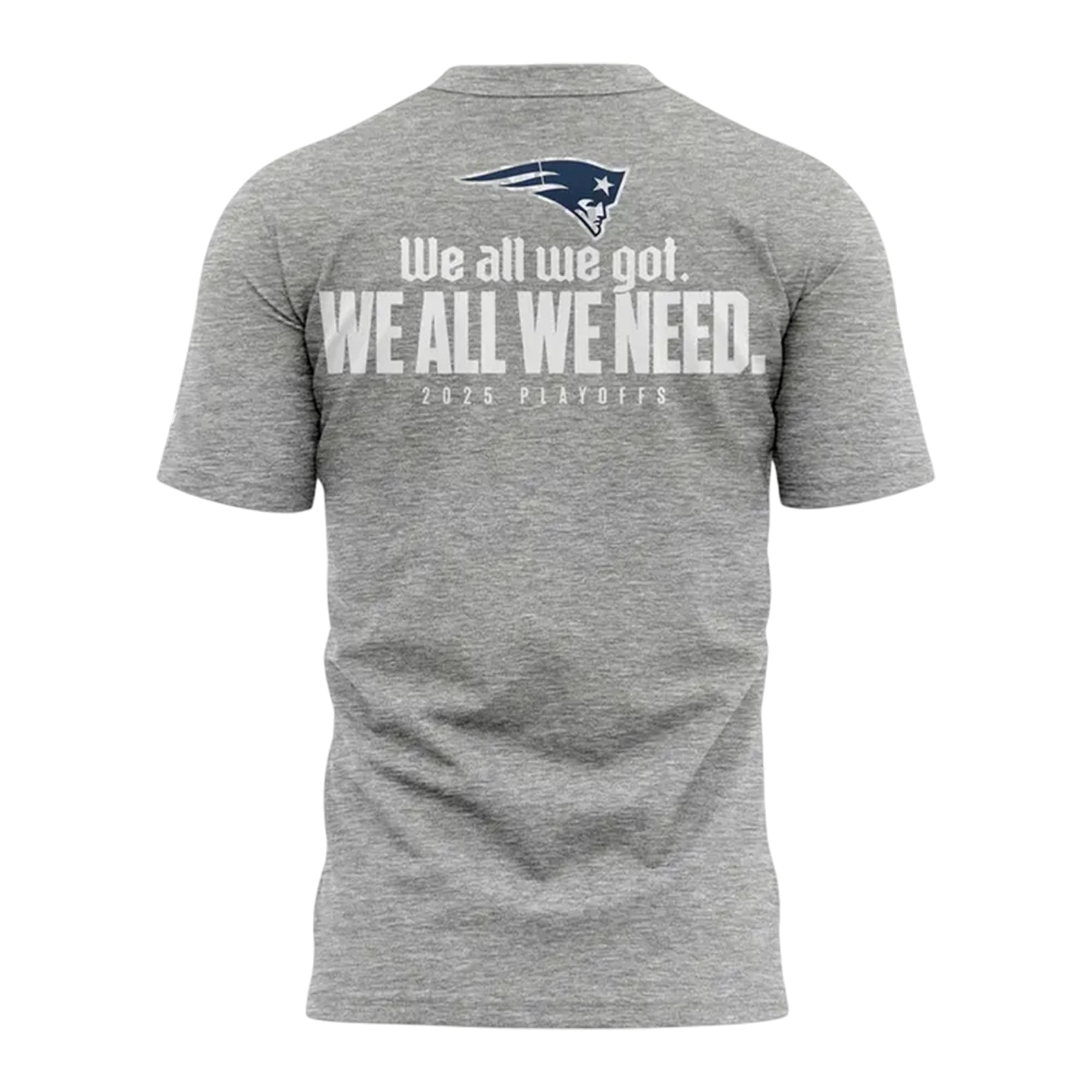 On the back, the statement “We all we got. We all we need.” captures the heart of the Patriots’ playoff run. This message highlights unity, trust, and collective effort—values that define a true championship team. Subtle 2025 Playoffs details add historical context, making the shirt more than just fan apparel.