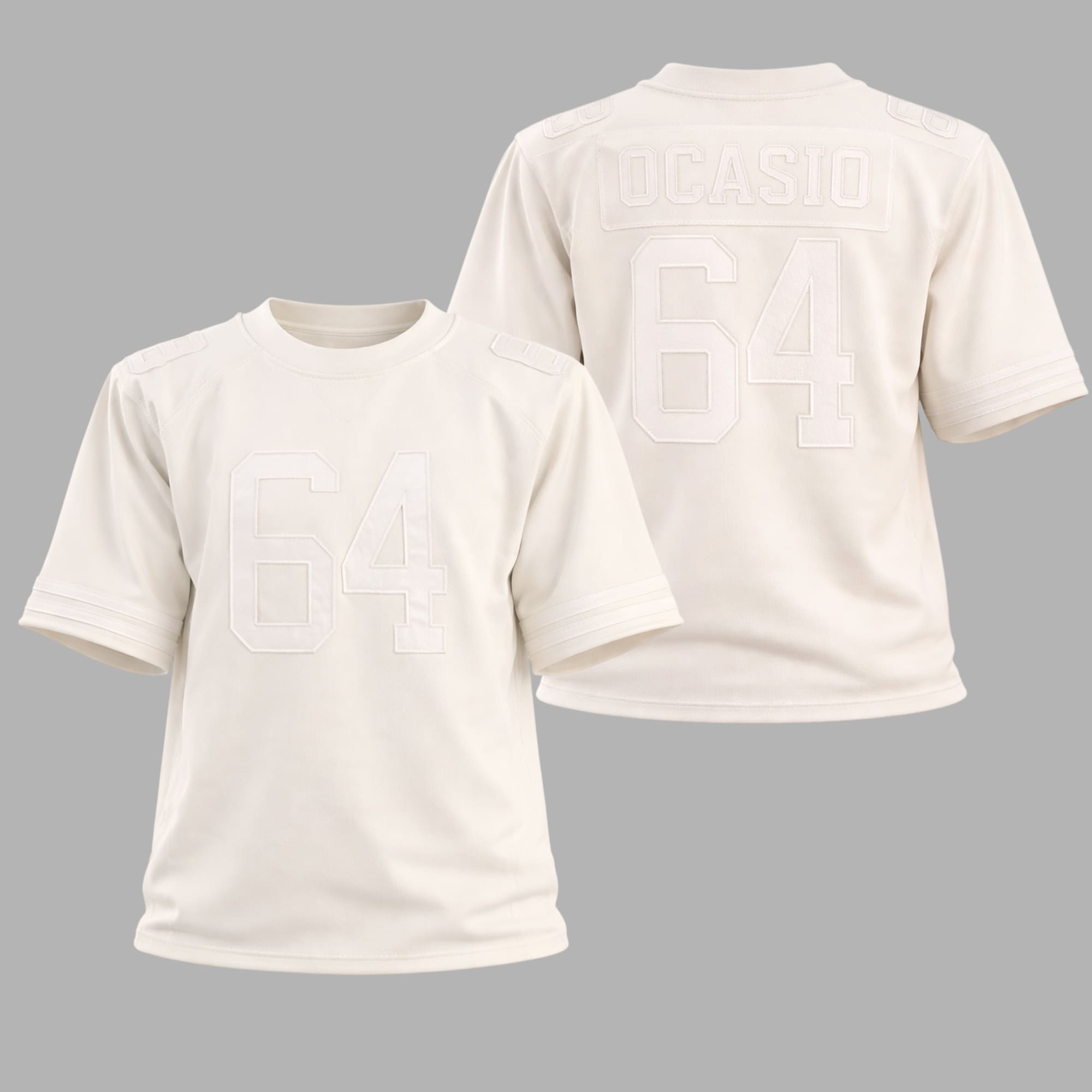 The design features a minimalist all-white base with bold stitched numbers on the front and back, paired with the name “Ocasio” across the shoulders. The number 64 stands out as a symbolic, performance-ready mark—blending sport, music, and identity in true Super Bowl Halftime fashion. Subtle shoulder details and structured paneling give the jersey a premium, stage-inspired look that mirrors what Bad Bunny wore under the world’s biggest spotlight.
