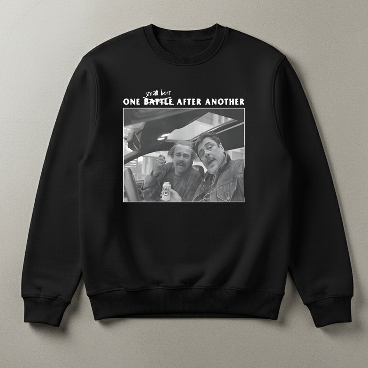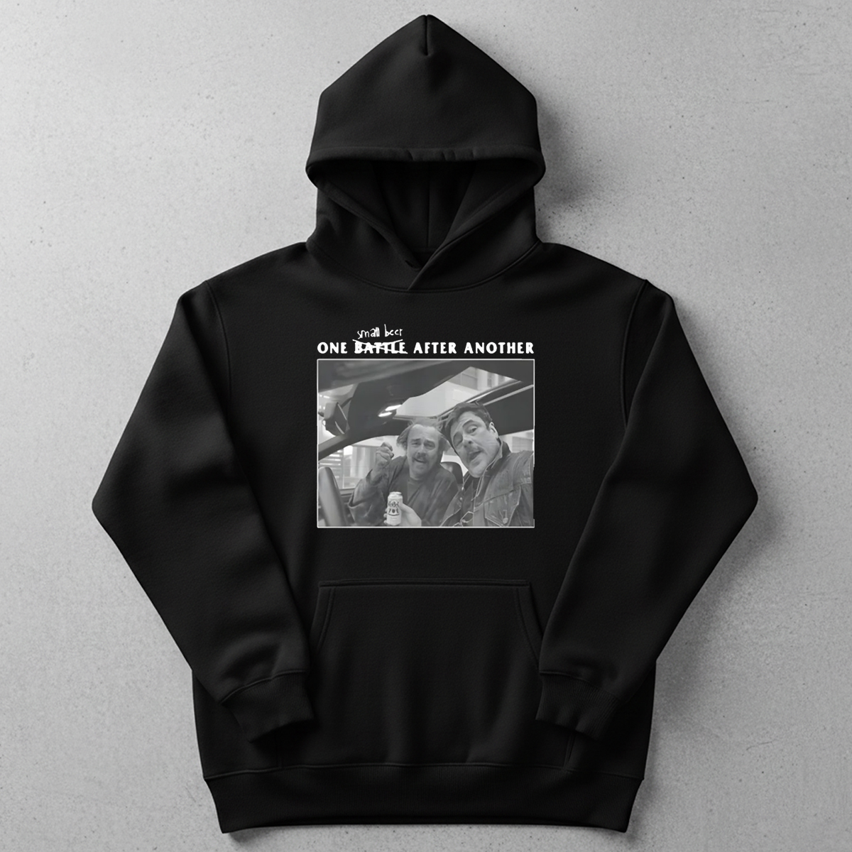 The One Small Beer Battle After Another T-Shirt features a black and white design inspired by a memorable scene from a cult classic movie. The two characters, sharing a beer and a laugh, embody the idea of overcoming life’s small battles. With the witty caption One BATTLE After Another this shirt is both nostalgic and humorous.