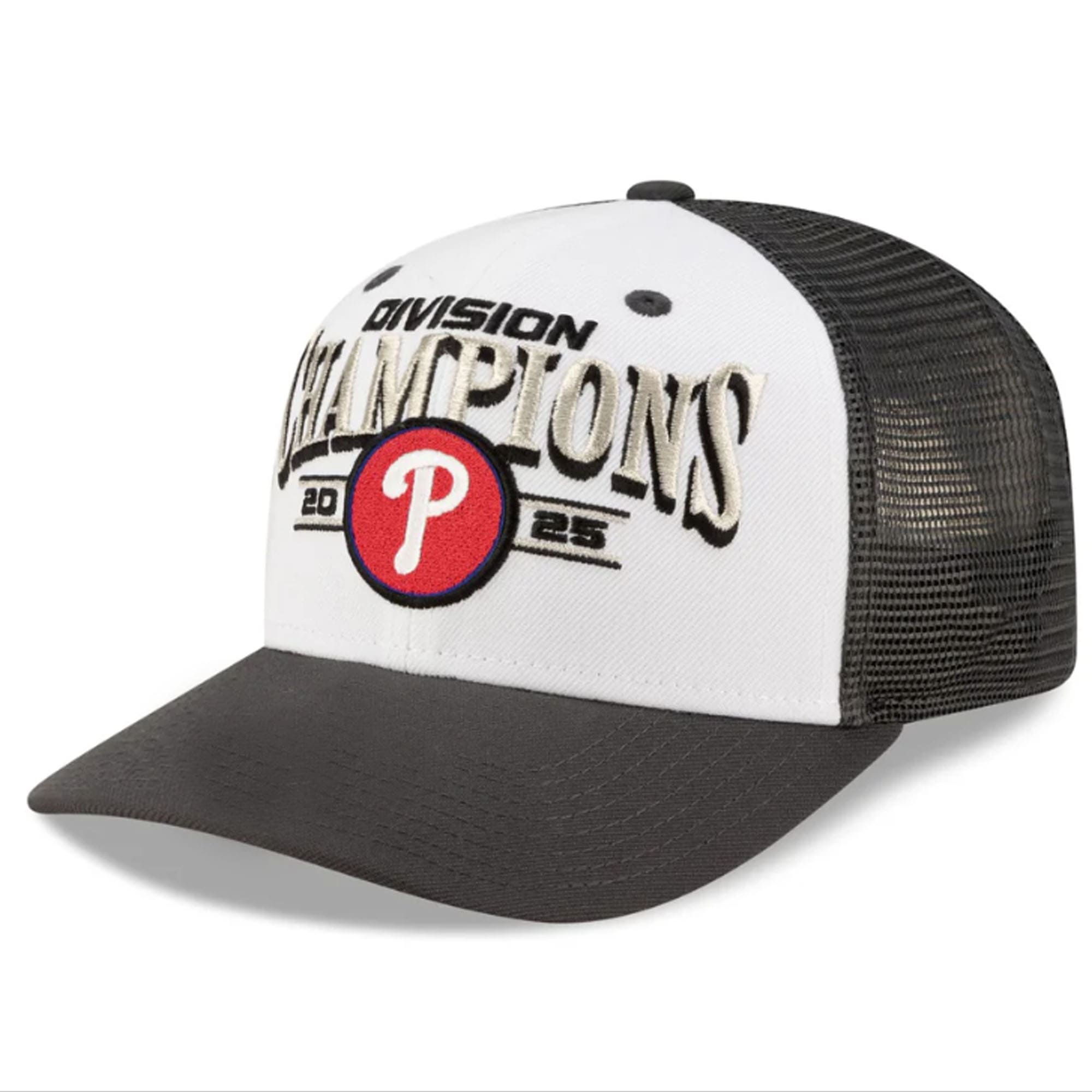 This hat features a structured white front panel showcasing raised “Champions 2025” embroidery and a vibrant red “P” emblem, instantly catching attention. The contrasting dark brim and breathable black mesh back create a timeless trucker-style silhouette.