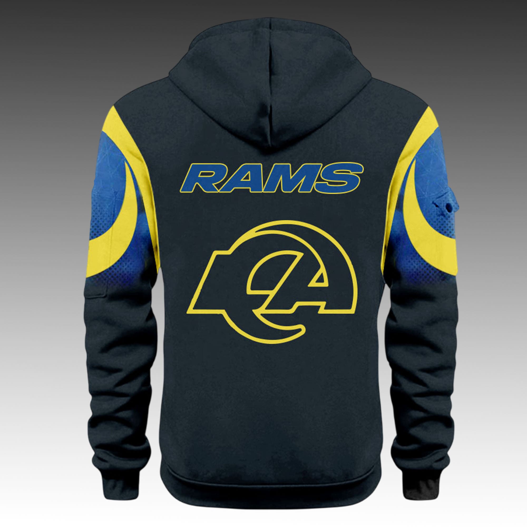 - Design: The sleek navy base is paired with vibrant yellow and blue accents on the sleeves and shoulders, creating a dynamic look. A prominent Rams logo on the chest and back ensures everyone knows where your loyalty lies.