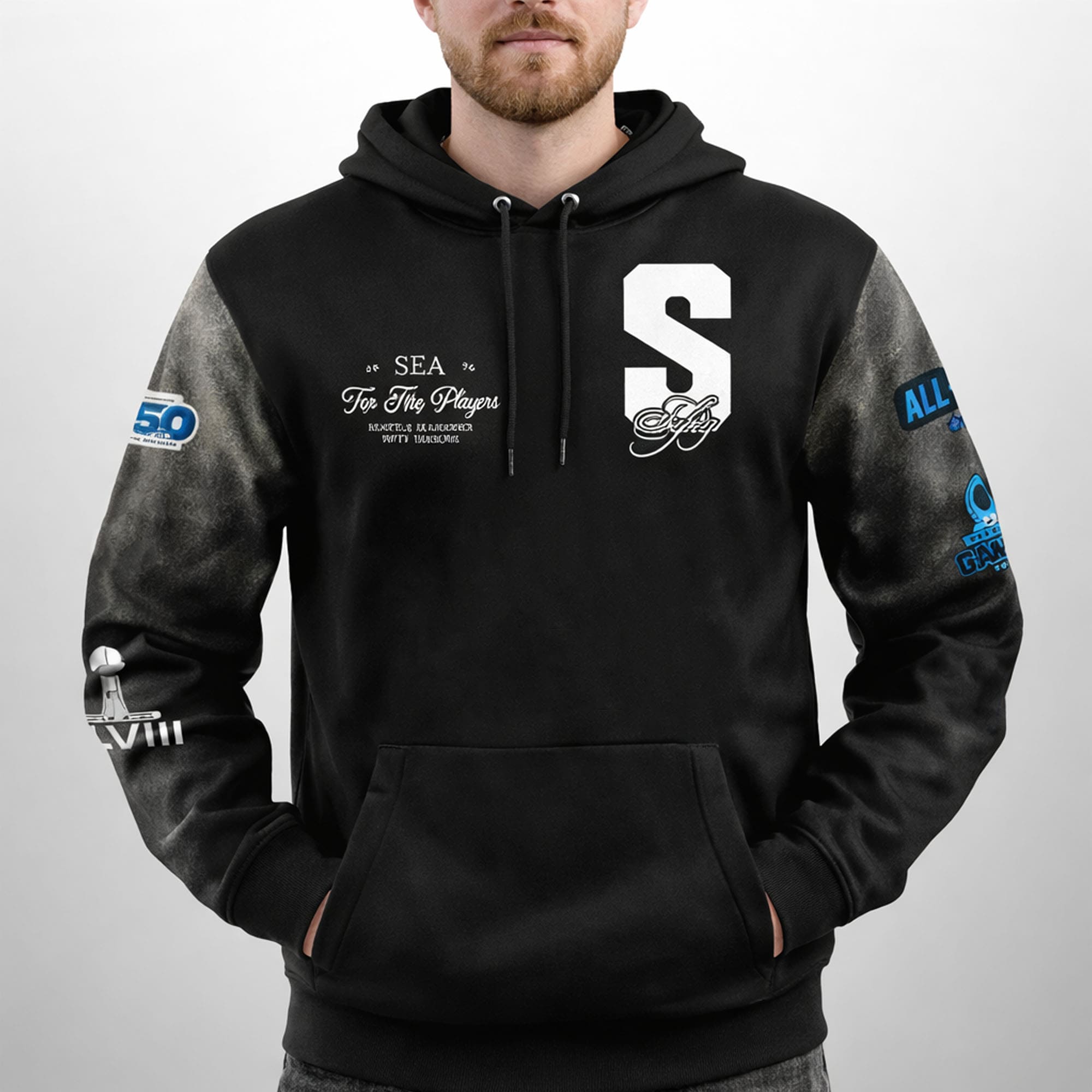 The Seattle Seahawks Top Fifty Player Hoodie is designed to celebrate greatness, history, and the elite players who defined Seahawks football. With a bold black base and high-contrast graphics, this hoodie delivers a commanding presence from every angle. The front features a strong, minimalist emblem that represents strength and leadership, while the back proudly showcases the iconic Seahawks mark paired with clean typography. Detailed sleeve graphics add depth and storytelling, symbolizing accolades, milestones, and the journey of top-tier players who helped shape the franchise. This design is not just about style—it represents pride, loyalty, and respect for the Top Fifty players who left a lasting impact on the game.