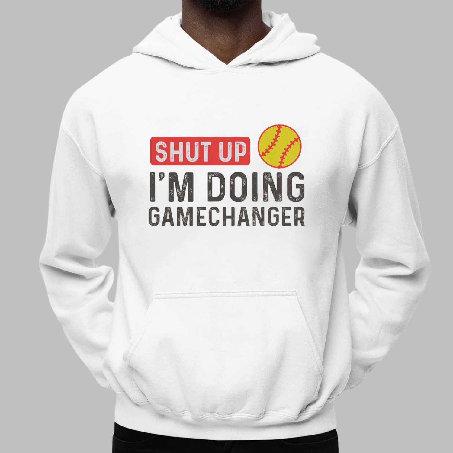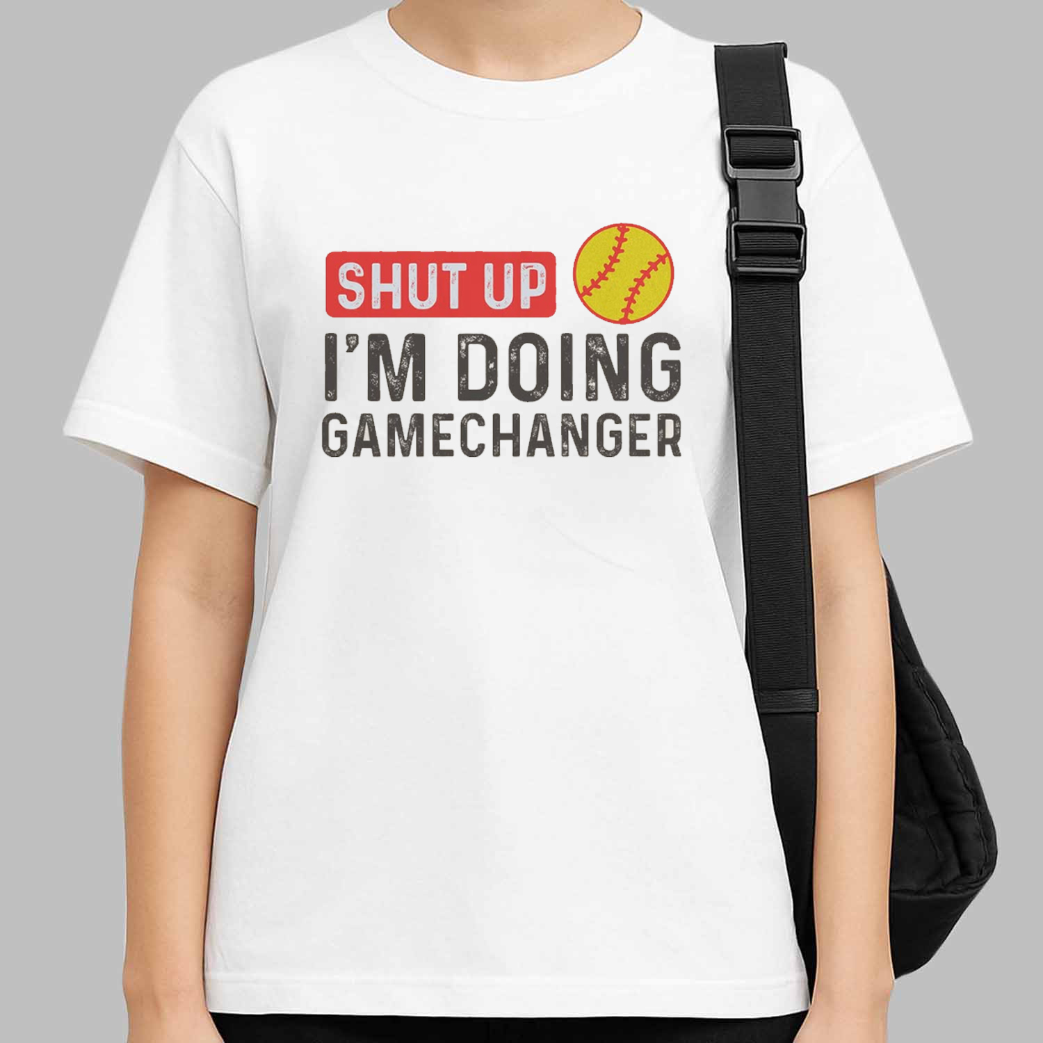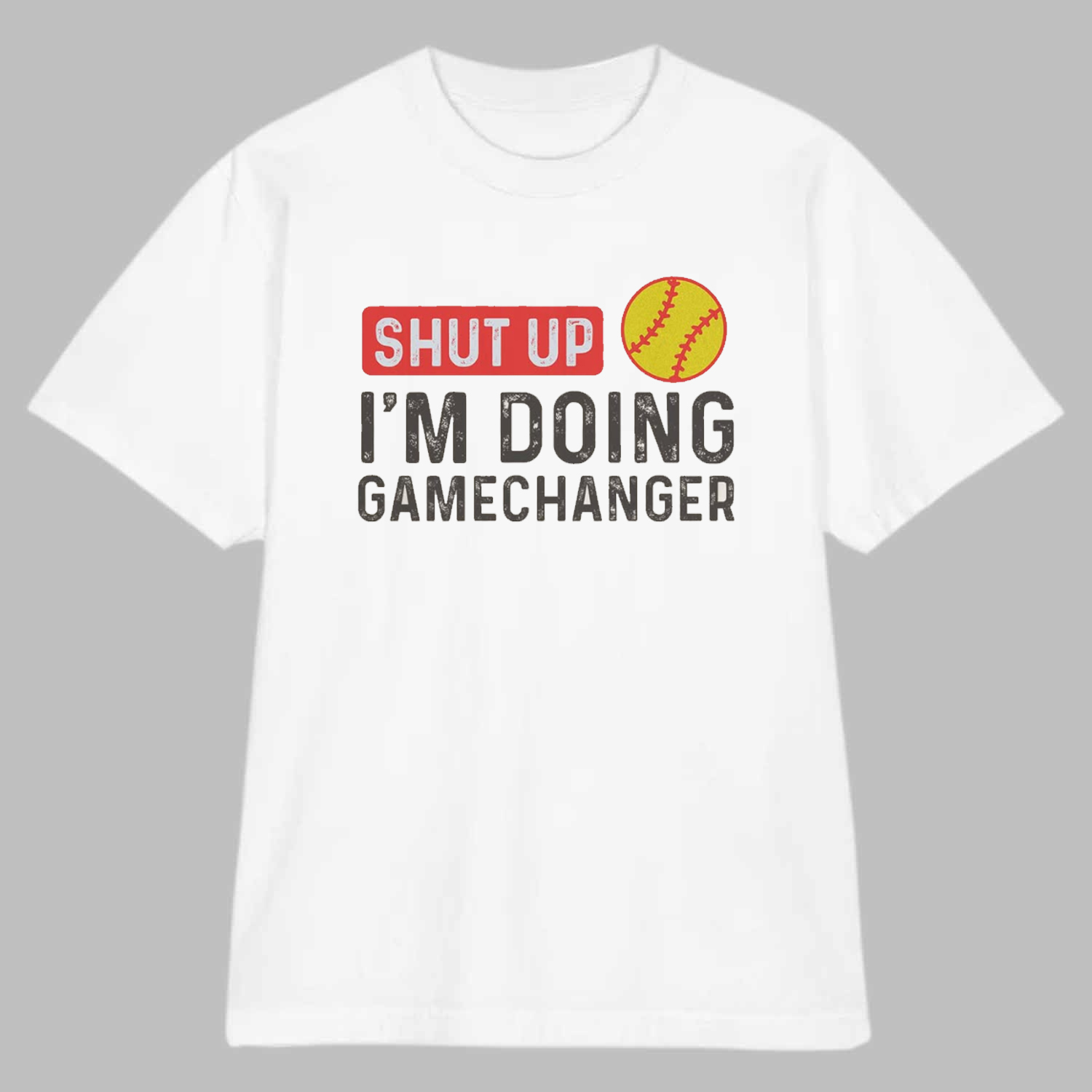 This crisp white, short-sleeved shirt is crafted for comfort and durability, making it an ideal choice for athletes, coaches, or dedicated fans. The front of the shirt features bold, impactful text: “SHUT UP” is prominently displayed in a red, distressed block with a white border, immediately grabbing attention. Below it, “I’M DOING” is printed in a strong, dark gray, followed by “GAMECHANGER” in a slightly lighter gray, completing the assertive message.