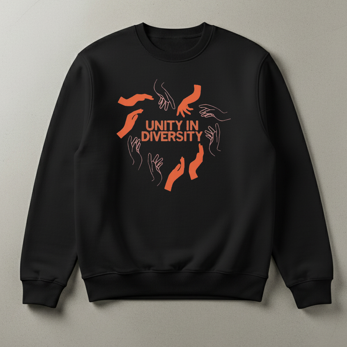 The phrase Unity in Diversity has become a widely recognized call for embracing differences, whether cultural, racial, or ideological, to foster a more inclusive and compassionate world. The image of hands, universally understood as symbols of support, cooperation, and solidarity, reinforces this message of unity. The hands in different orientations symbolize people coming together despite their differences, working as one to create a stronger whole. The design was inspired by the global movement toward social inclusion, equality, and the power of collective action.