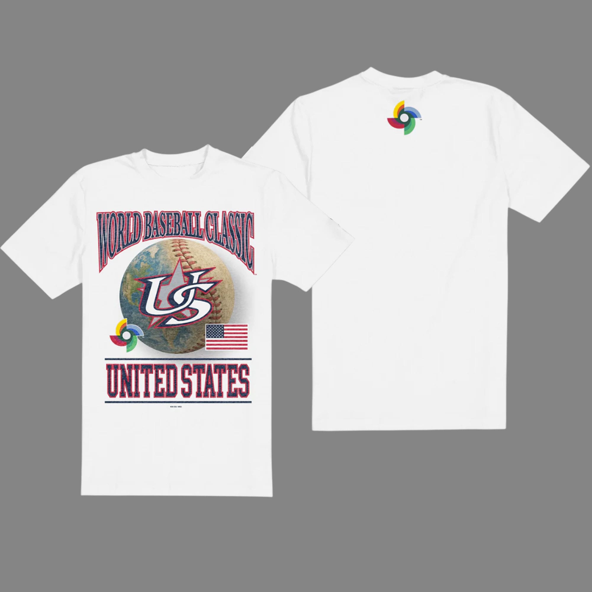 The front design features bold “World Baseball Classic” lettering arched across the chest, emphasizing the prestige of the 2026 tournament. At the center, a detailed baseball globe graphic blends the sport with worldwide competition, symbolizing the global nature of WBC 2026. The large “US” emblem layered over the baseball showcases national pride, while the American flag detail reinforces support for Team USA. On the back, a clean finish with the WBC logo near the collar gives the shirt a complete, balanced look.