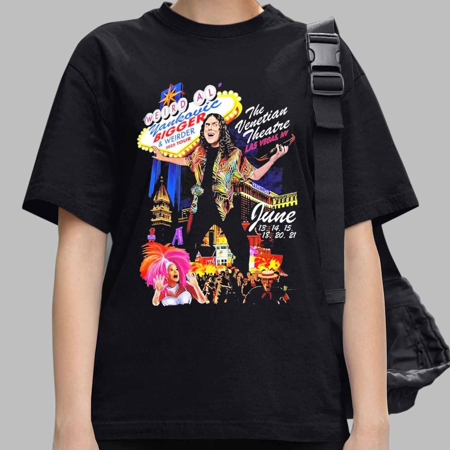 The design is a full-color explosion of everything we love about Weird Al: theatrical poses, wild patterns, and a backdrop of Las Vegas at its most animated. Front and center, Al strikes an iconic pose beneath a retro-style marquee announcing the “Bigger and Weirder 2025 Tour.” Around him, you’ll spot a pink-haired showgirl, a guitar-wielding cowboy, and an apocalyptic crowd scene that only makes sense in Al’s wonderfully weird universe. Every inch of the print is packed with visual gags and references fans will instantly recognize.