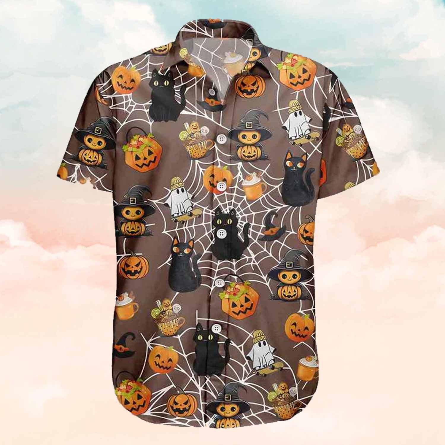 This short-sleeved Hawaiian shirt, on a dark brown background, features a repeating pattern of charming black cats (some with witch hats), whimsical pumpkins (some jack-o’-lanterns, some witch-hatted), and friendly sheet ghosts. Interspersed are candy baskets, mugs, and subtle spiderwebs, all in a charming, cartoonish style.