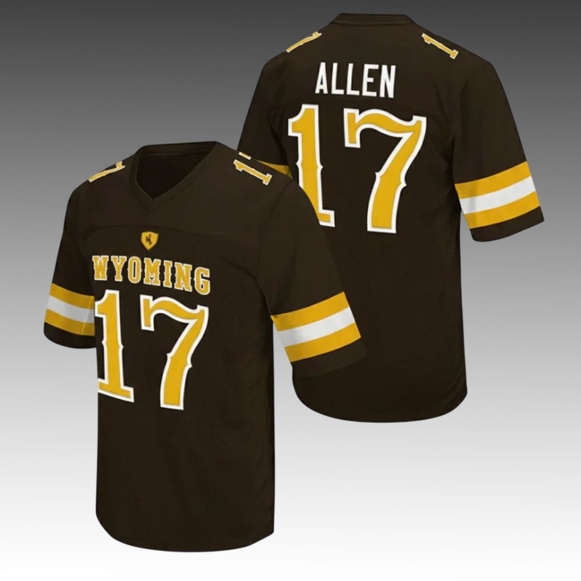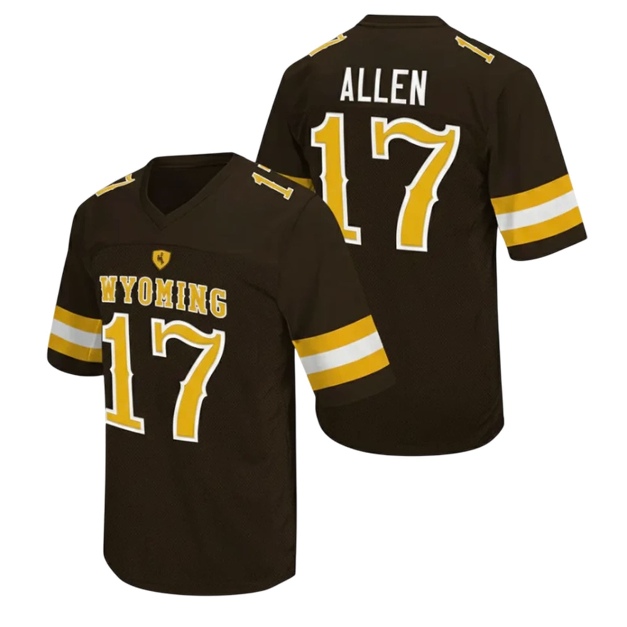 Designed in rich brown with striking gold and white accents, this jersey features “WYOMING” across the chest, Allen’s name on the back, and his iconic #17 displayed in oversized varsity-style font. Shoulder details add a classic on-field touch, while the V-neck design completes a sharp, athletic silhouette that stands out on game day or daily wear.