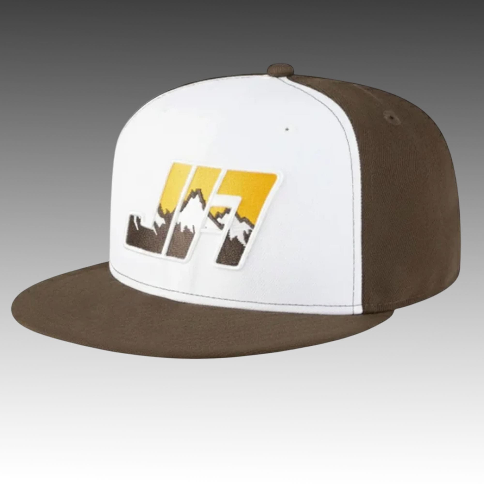 This hat features a crisp white front panel with a striking mountain-inspired “JA” graphic in warm sunset tones, paired with rich brown side panels and a classic flat brim. The embroidered bucking horse logo on the side adds an authentic Wyoming touch, bringing the full spirit of the West together in one standout piece. Its structured shape and balanced color palette make it both wearable and visually sharp for everyday use.