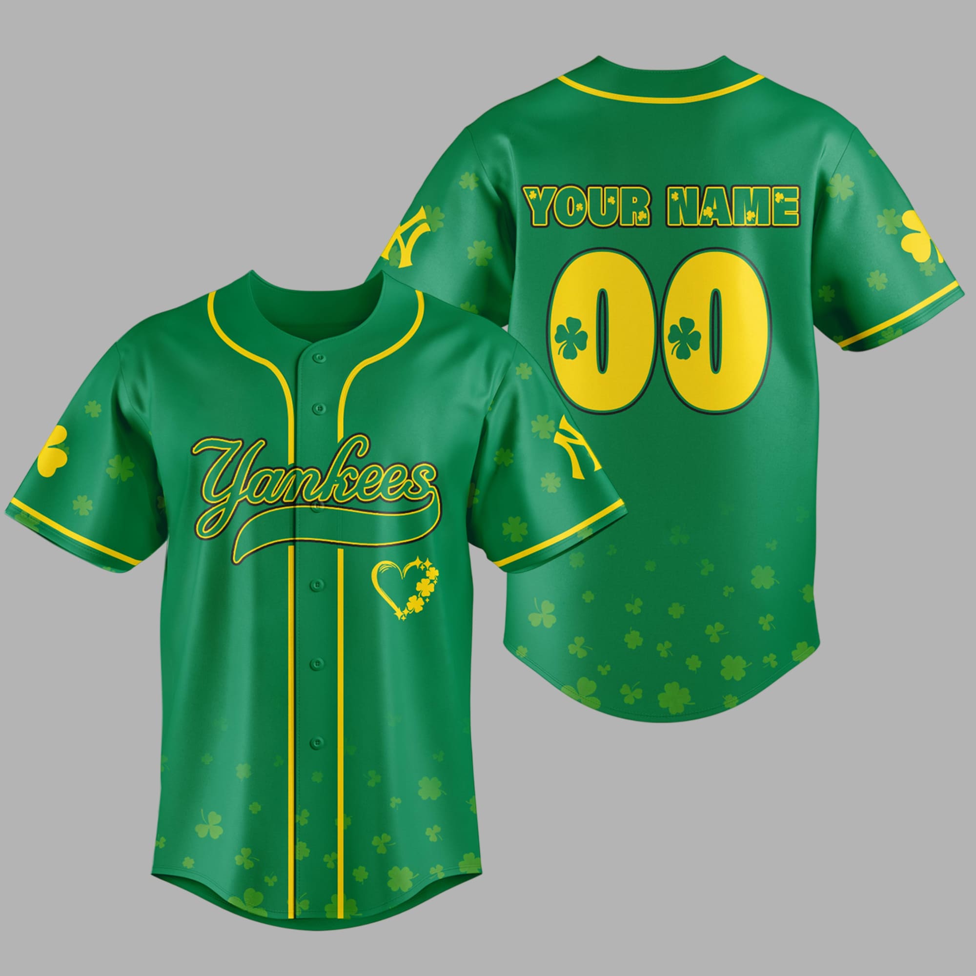 Celebrate St. Patrick’s Day with a fresh twist on a classic baseball look in the Yankees 2026 Patrick’s Day Lucky Custom Jersey. This jersey brings festive energy with a rich clover-green base and subtle shamrock patterns throughout, creating a lucky vibe that still feels clean and wearable. Bright gold piping outlines the button-up front and sleeves for a premium finish, while the “Yankees” script across the chest adds bold presence that stands out in photos and under stadium lights. A small heart-and-clover accent completes the design with a playful St. Patrick’s Day touch. The back makes it truly yours—add YOUR NAME and 00 to create a one-of-a-kind jersey for watch parties, stadium trips, group outfits, or gifting.