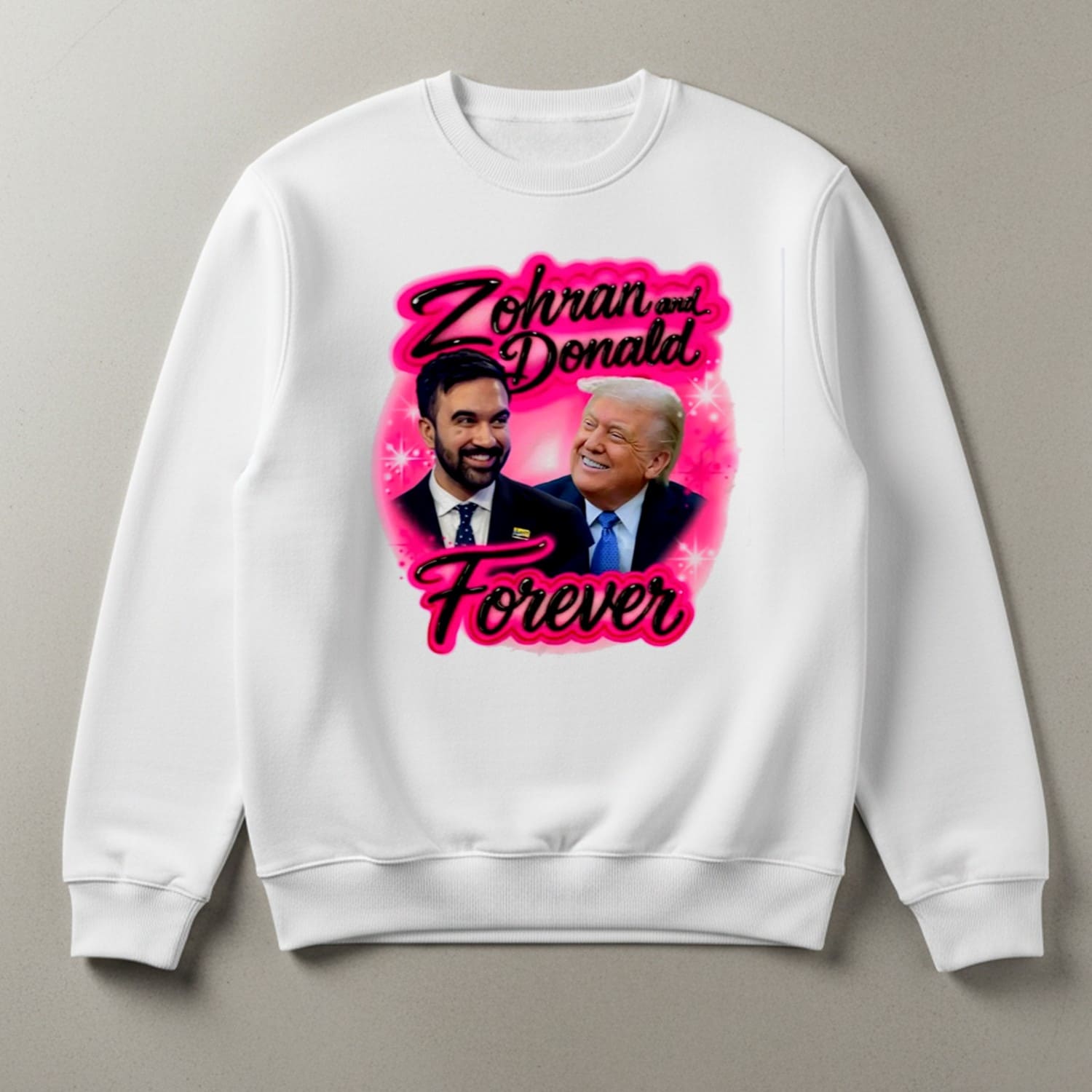The Zohran and Donald Forever Airbrush Shirt turns a surprising duo into a vibrant, eye-catching piece of art. Designed in a retro airbrush style, this shirt features bright pink neon highlights, soft glowing edges, and a playful composition that gives it a nostalgic early-2000s flair. The graphic showcases the two figures smiling toward each other, symbolizing humor, contrast, and pop-culture mashups at their finest.